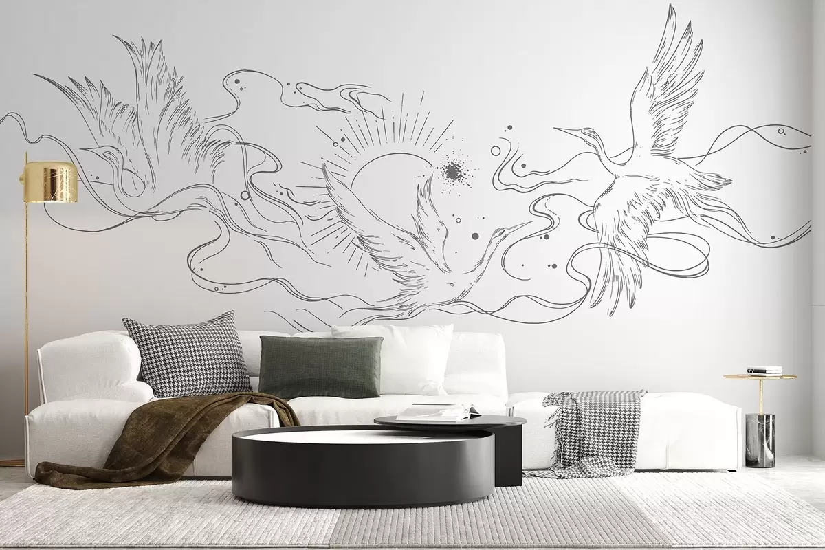 Zidne murale Ptice koje lete, crtanje linija, minimalizam, paleta sivih boja br. w02022v2