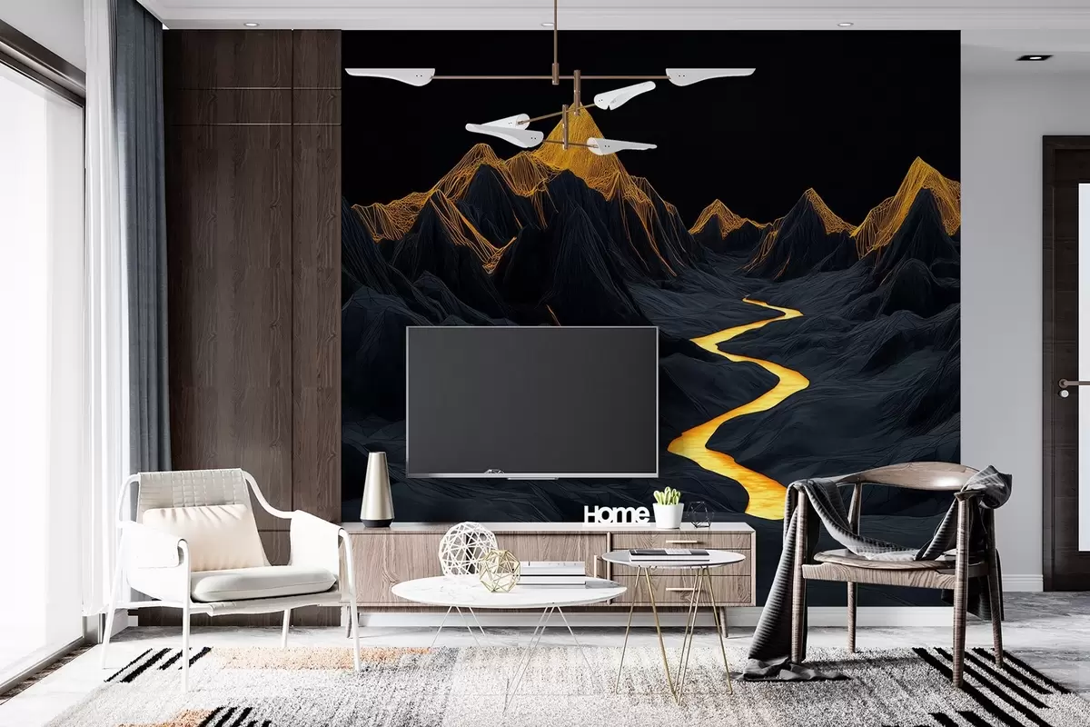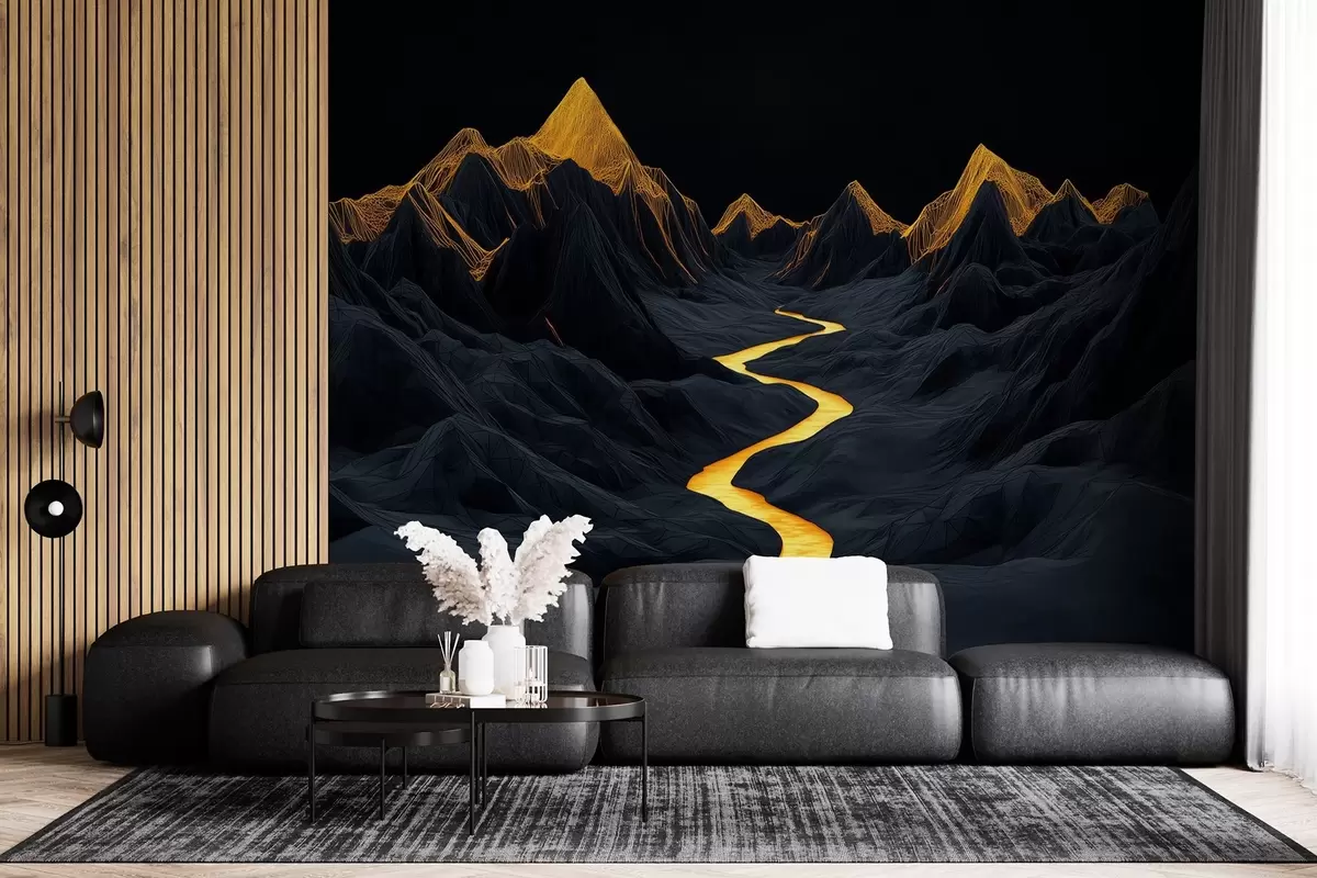 Zidne murale Poligonalni crni krajolik i rijeka između planina br. w02063