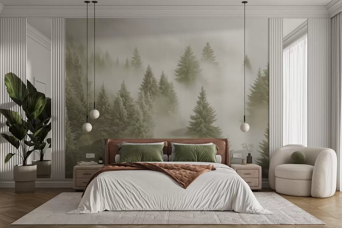 Zidne murale Gusta magla obavija snježnu jutarnju šumu u mekim zelenim nijansama br. w02064v2