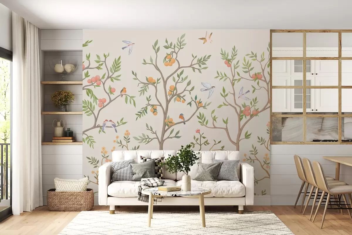 Zidne murale Chinoiserie dizajn s pticama, vijugavim drvećem, voćem i cvijećem br. w02128