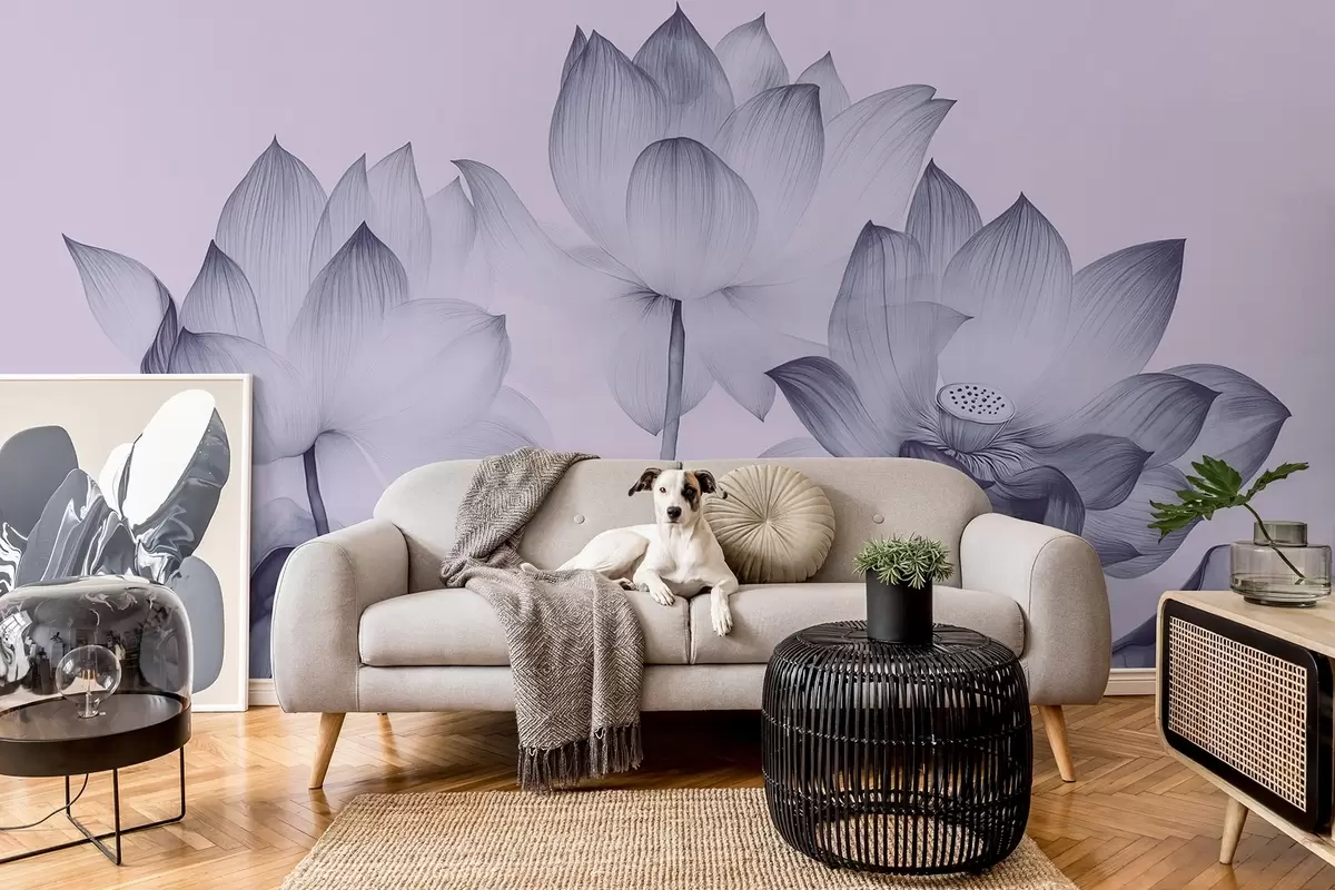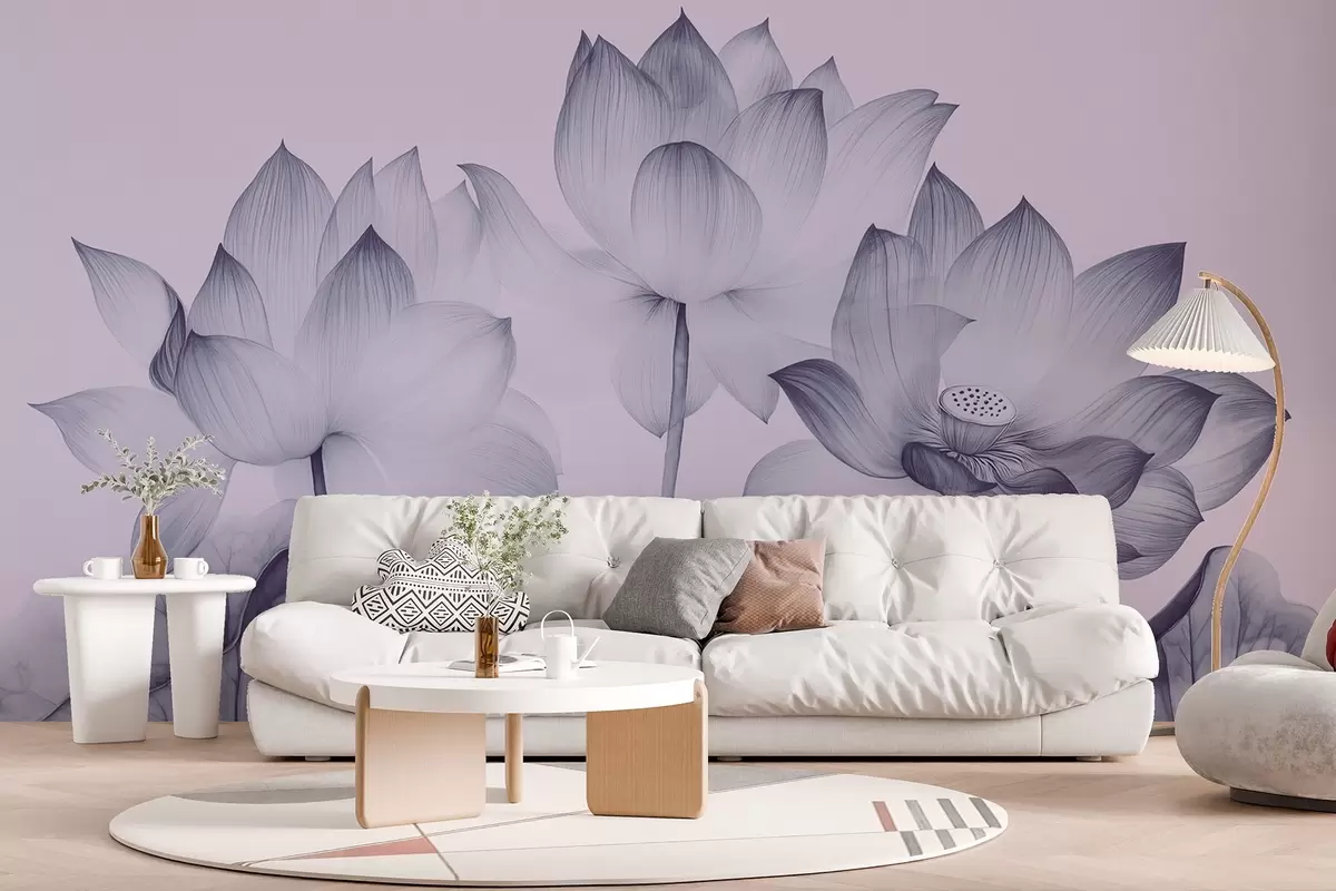 Zidne murale Tri lotosa s lišćem u stilu kineskog slikarstva u plavoj boji br. w02146v2