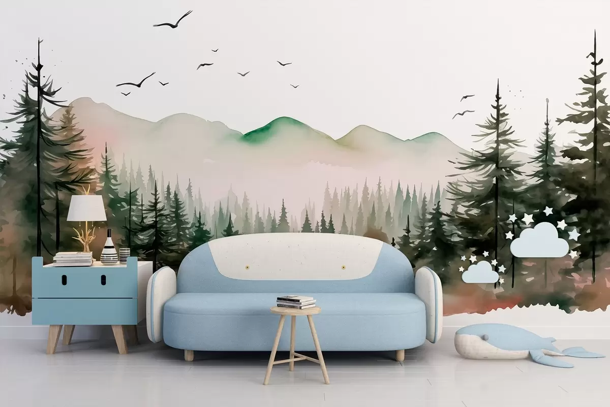 Zidne murale Akvarel šumski i planinski pejzaži, zelene i ružičaste boje br. w02150v1