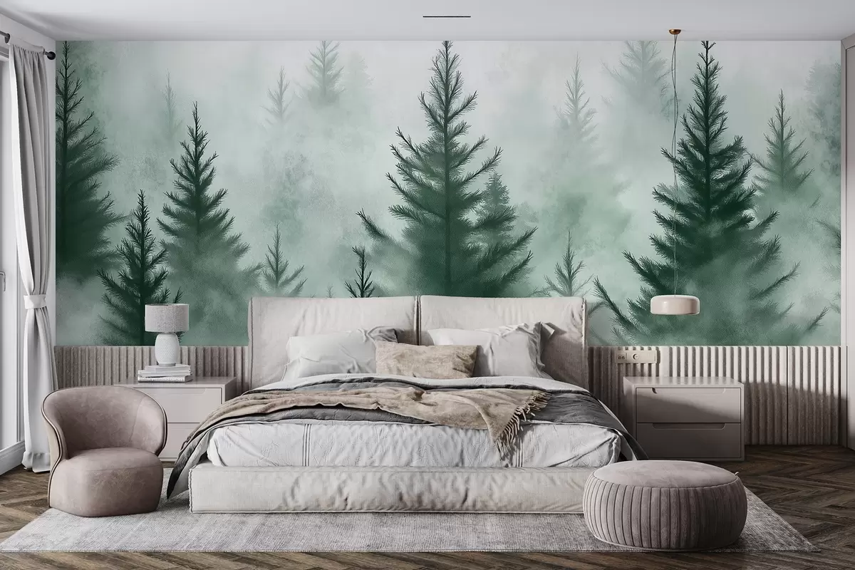 Zidne murale Šuma u magli, borovi, akvarel, zelene boje br. w02152v1
