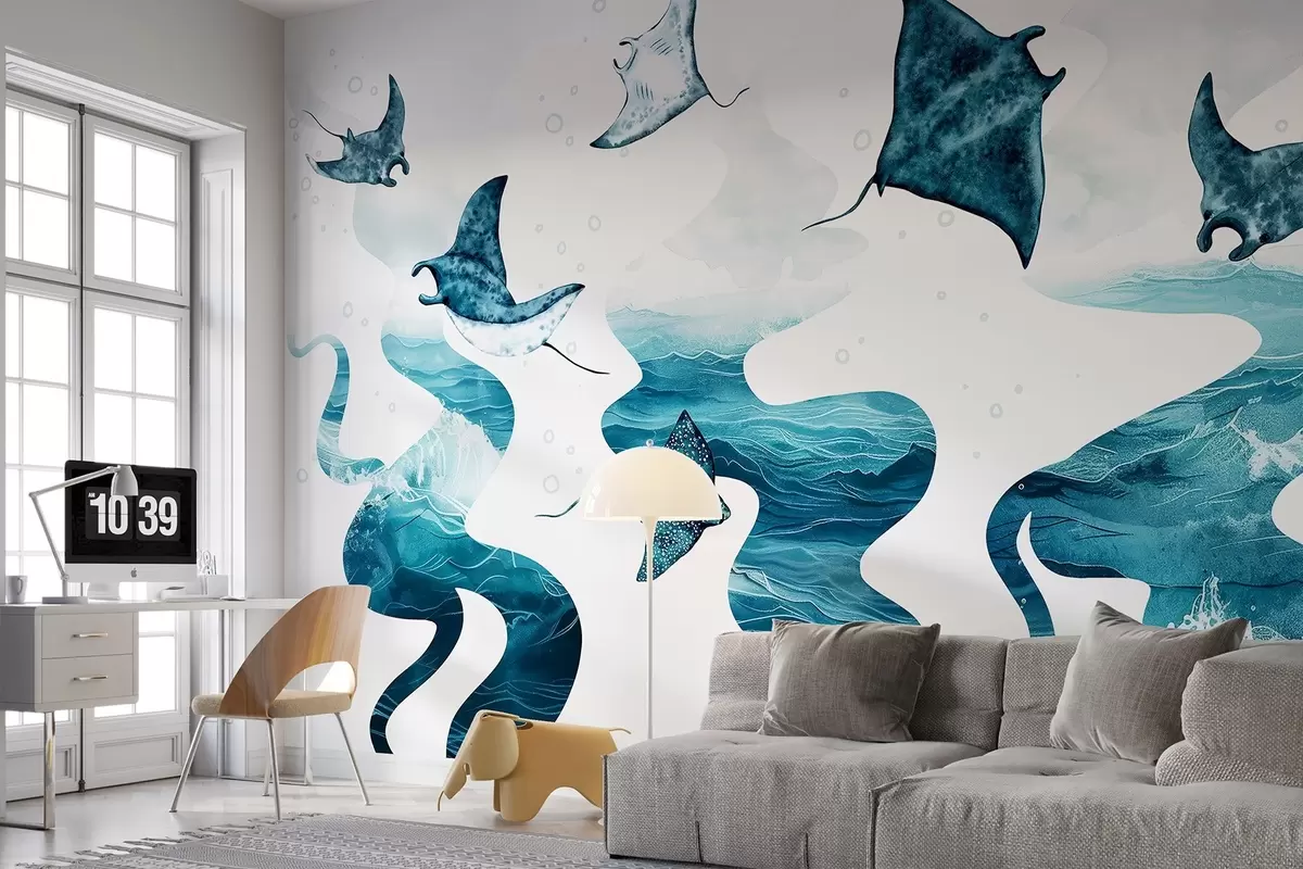 Zidne murale Manta raža, stil akvarela, more, ocean, plave boje br. w02266
