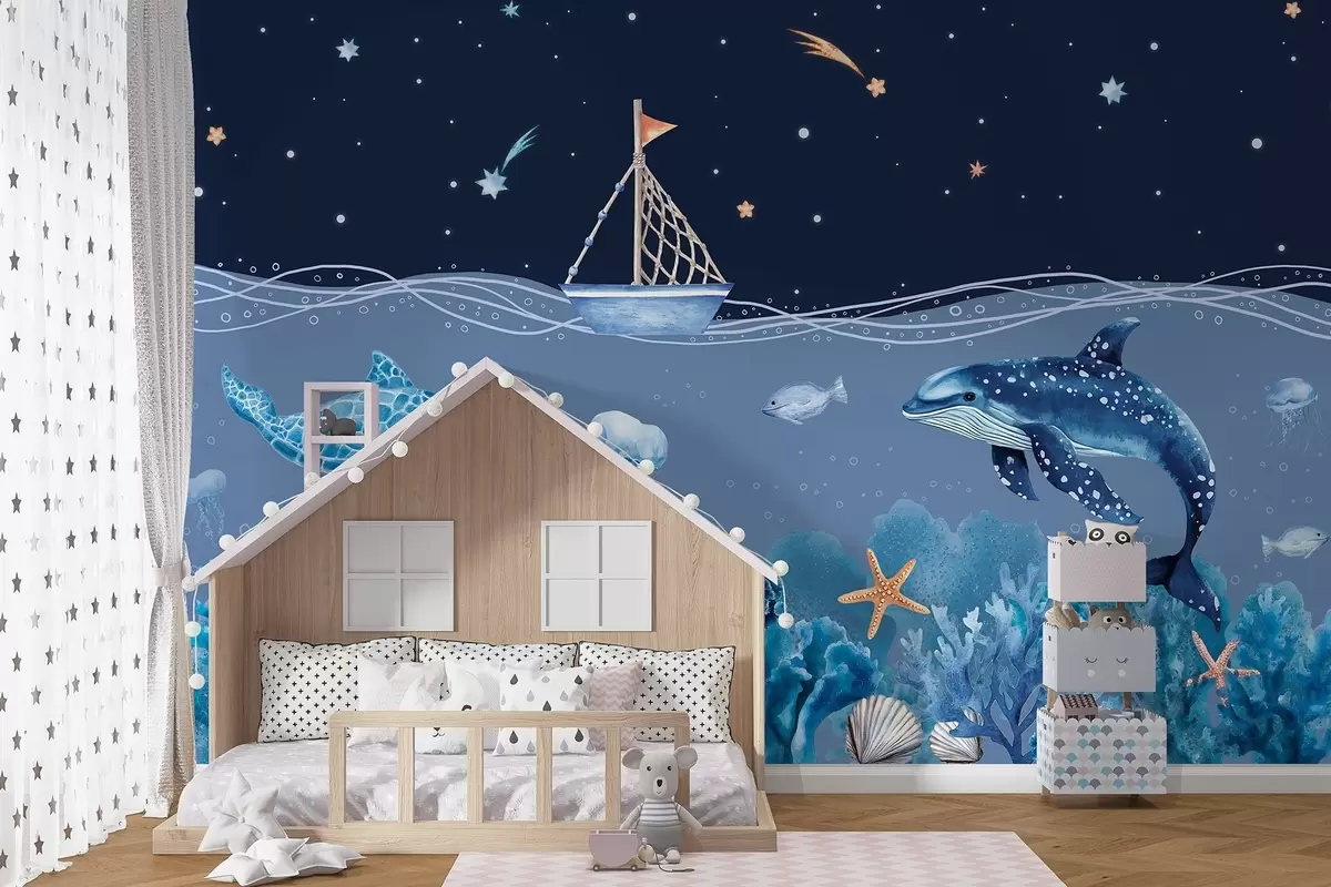 Zidne murale Morski život, stil akvarela, koralji, čamac, dupin, meduza, zvjezdano noćno nebo, plave boje br. w02310