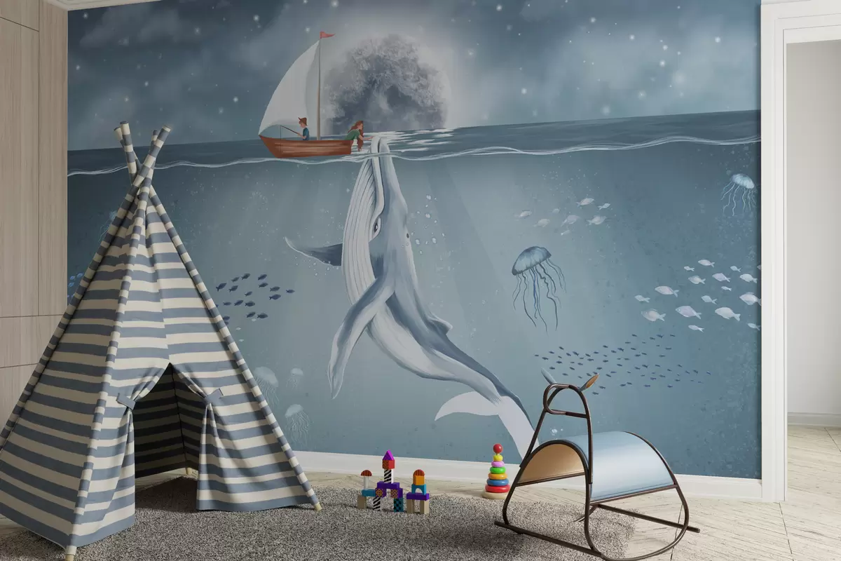 Zidne murale Dječji dizajn s kitom, mjesecom i brodom s djecom br. w02476