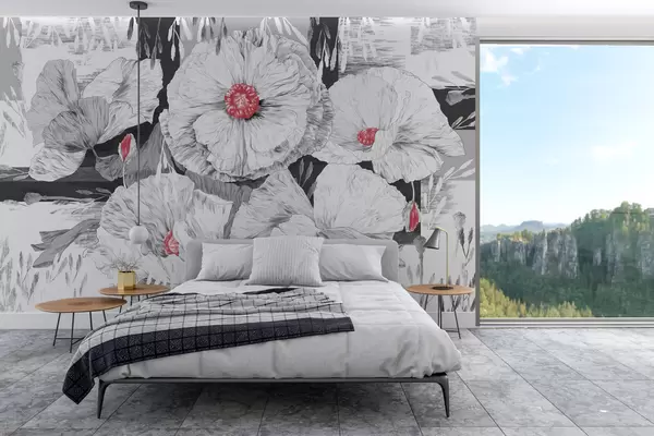 Zidne murale Crno-bijeli cvjetovi s crvenim središtem br. w02477