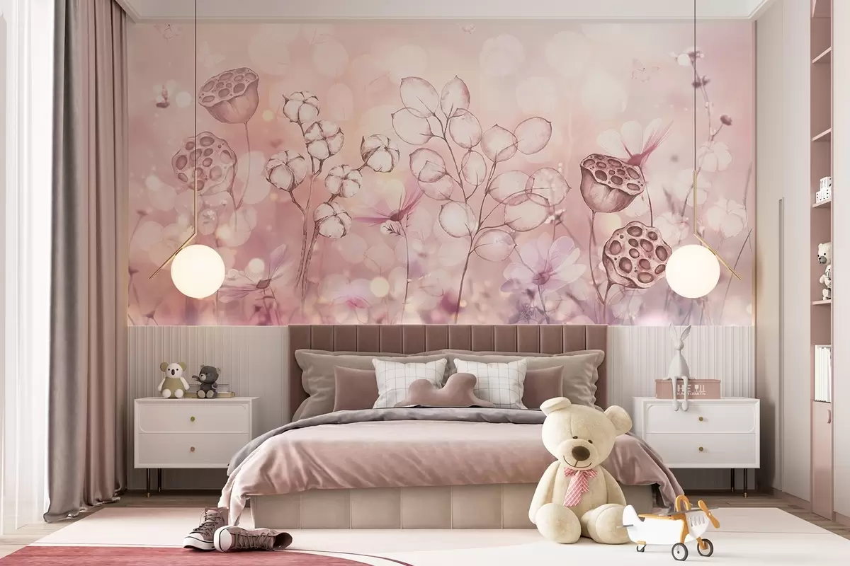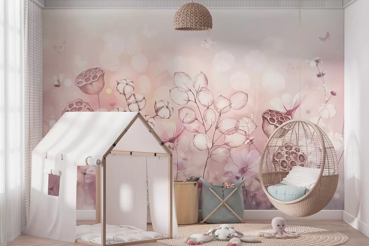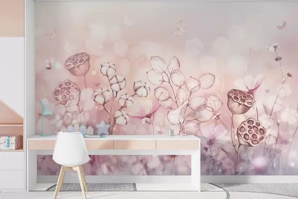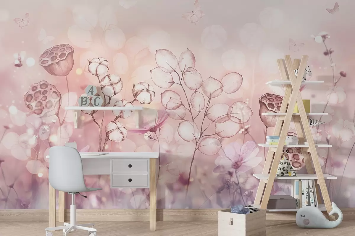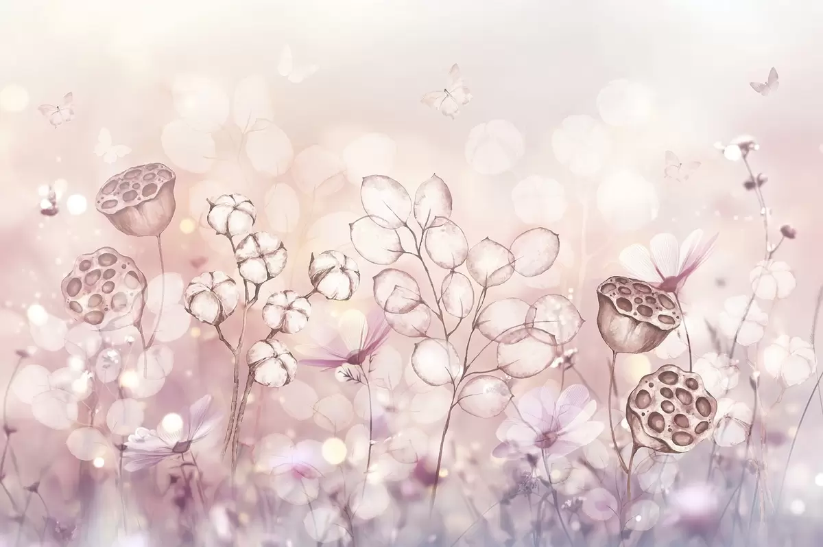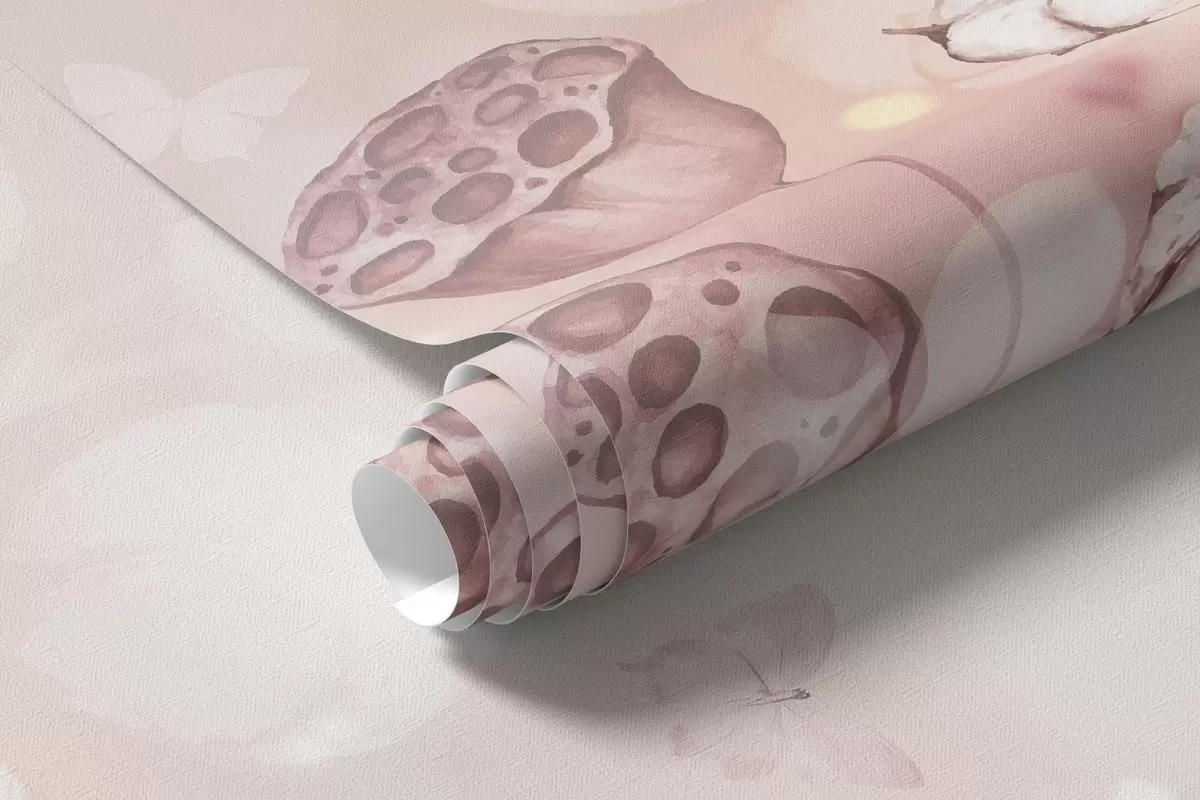 Zidne murale Sanjivi cvjetnjak, leptir, cvijeće pamuka, lotosi, ružičaste boje br. w02516