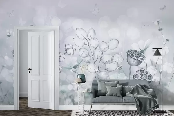 Zidne murale Sanjivi cvjetnjak, leptir, cvijeće pamuka, lotosi, sive boje br. w02516v2