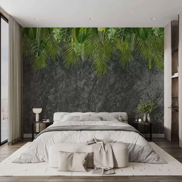 zidne murale tropsko lišće na pozadini imitacije kamena w02547