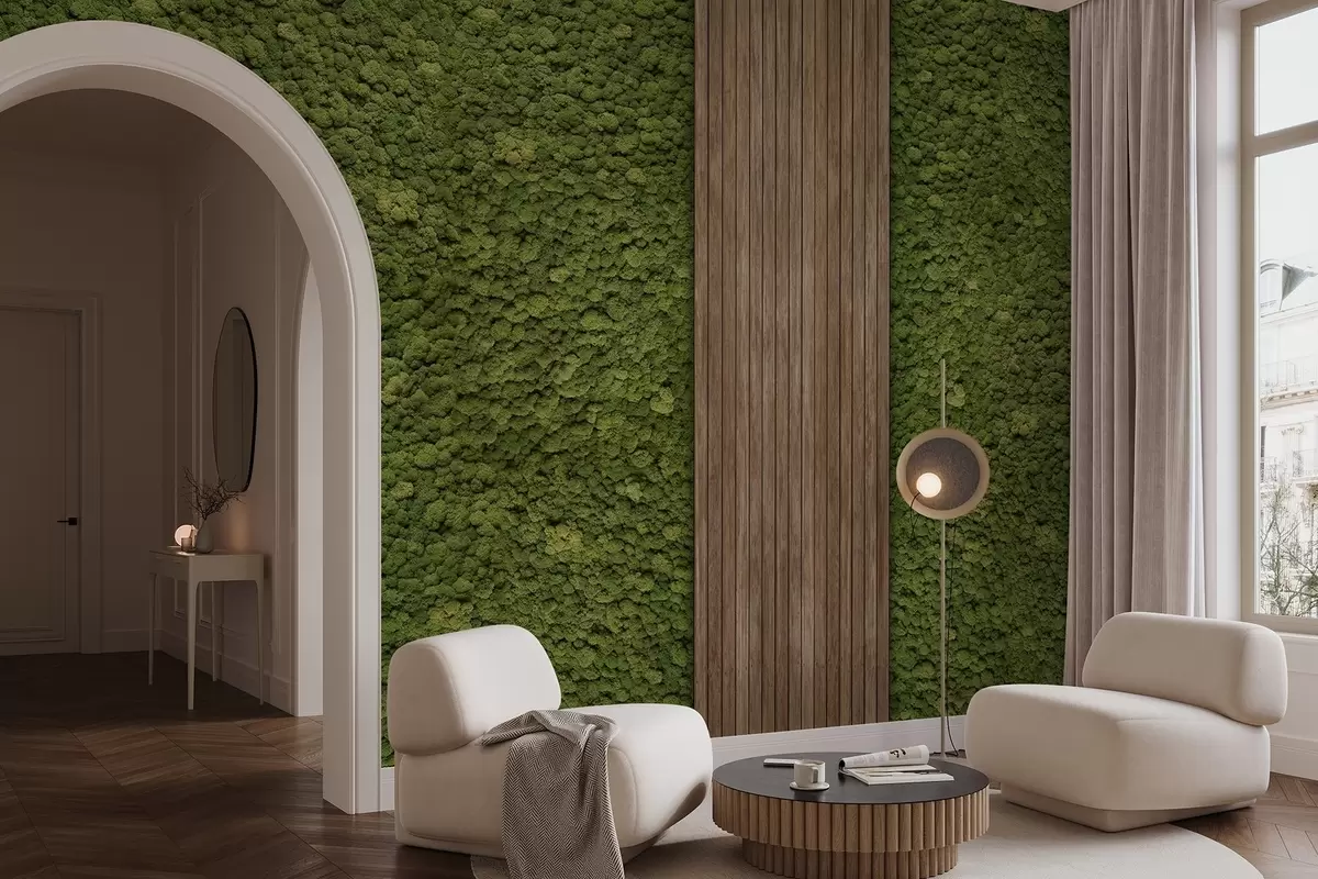 zidne murale Zid u stilu mahovine s drvenom pločom, bujne maslinaste boje w02656v3