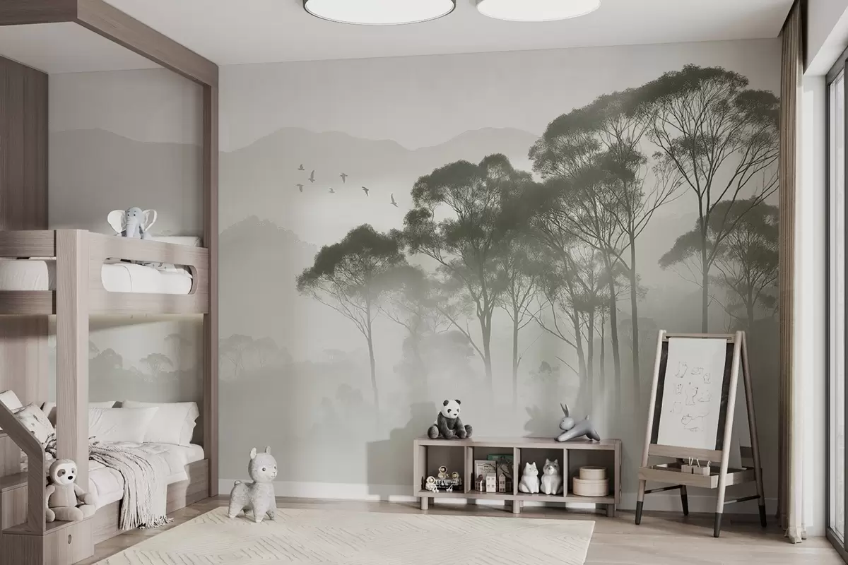 zidne murale Drveće u magli, prirodni pejzaži, ptice, sunce, zelene boje w02740