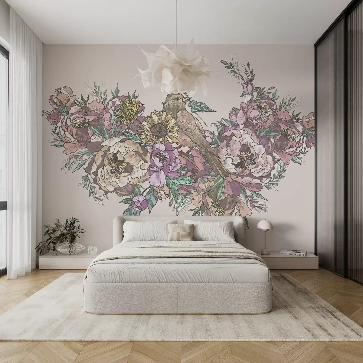 Zidne murale Vintage ptica i cvjetna ilustracija br. w02833
