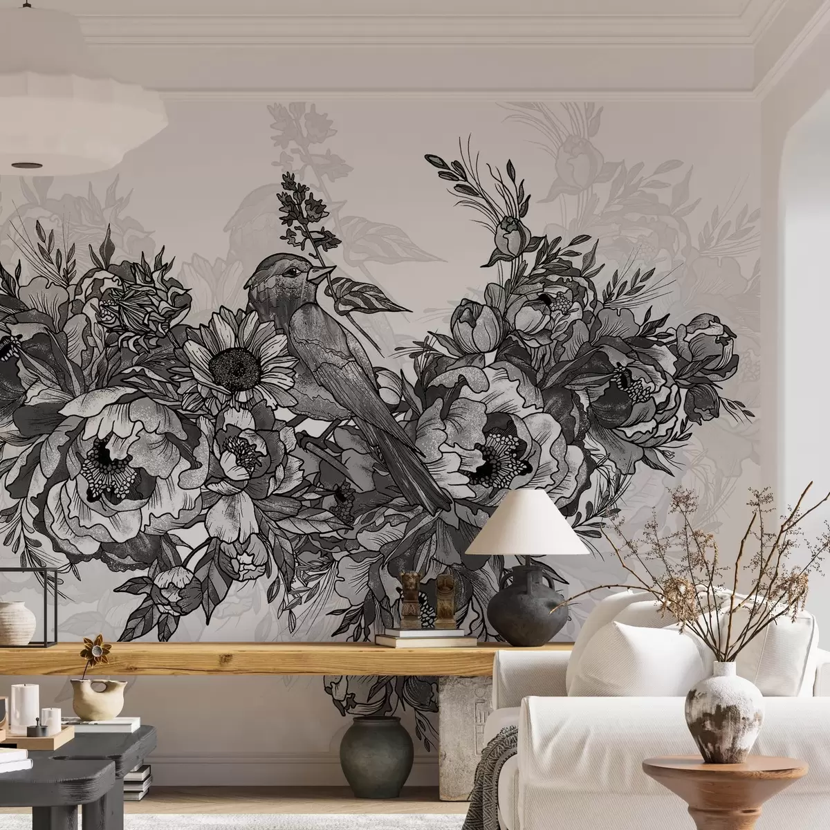 Zidne murale Jednobojna cvjetna i ptičja kompozicija br. w02834