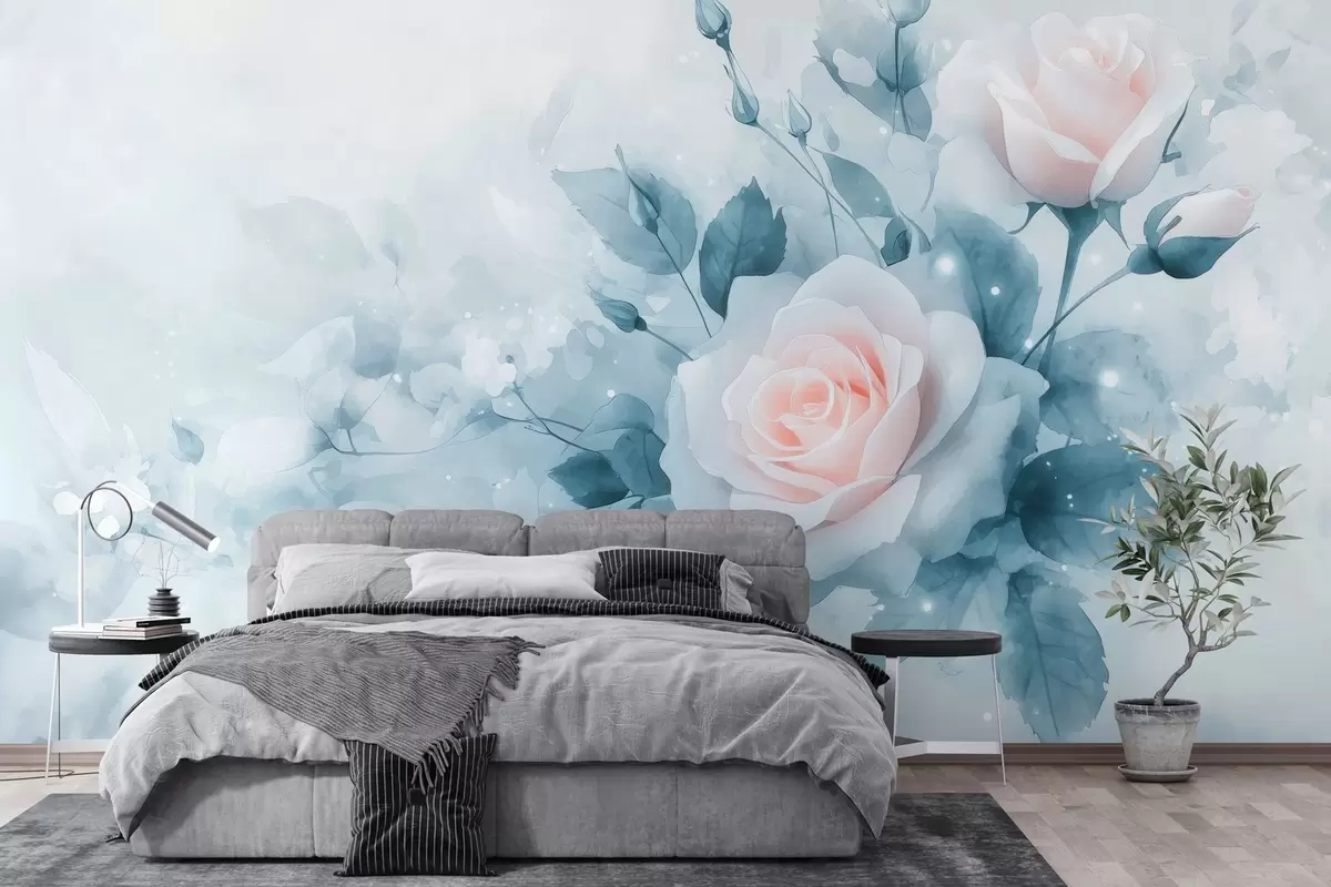 zidne murale Nježne ruže boje breskve u nijansama tirkiza u stilu akvarela w02871