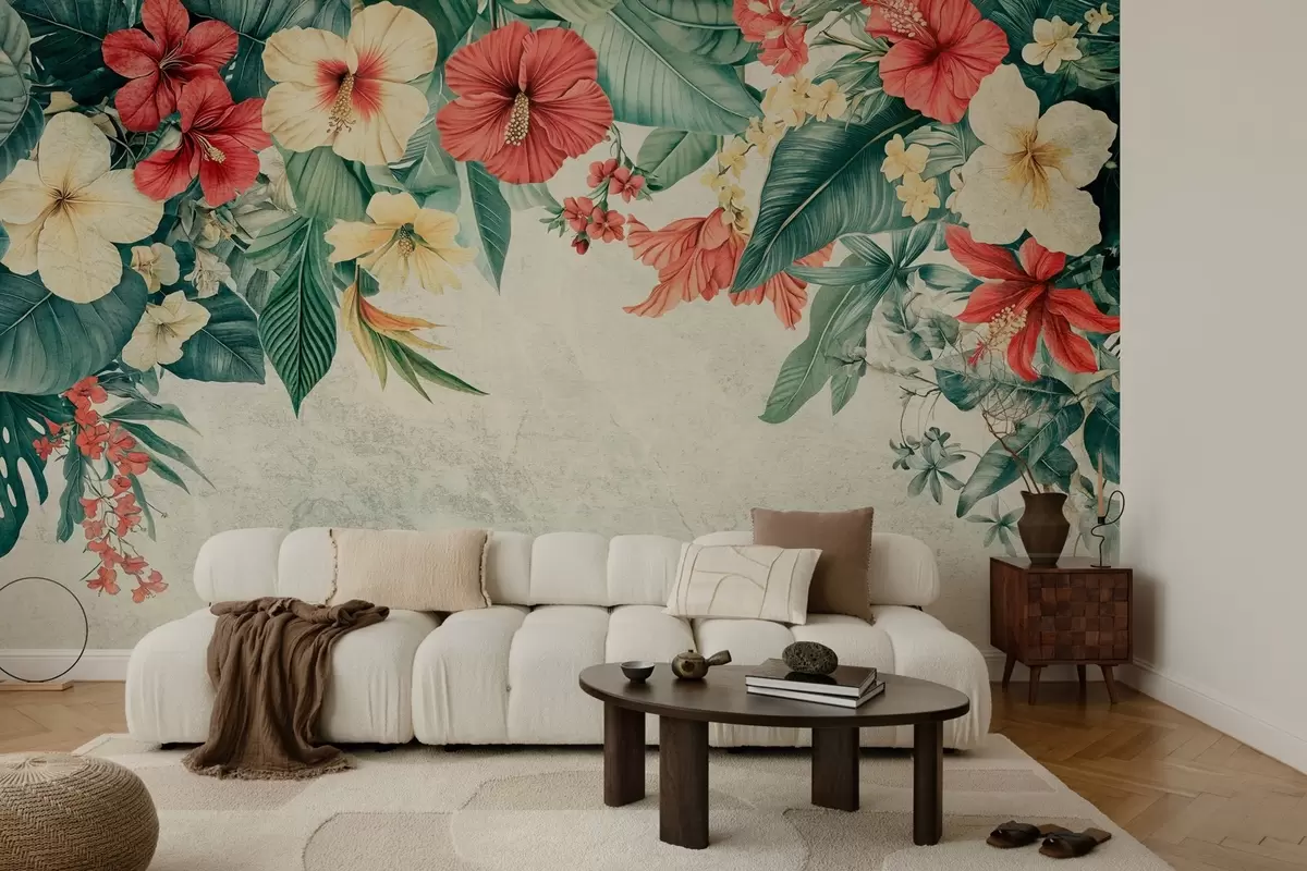 zidne murale tropsko cvijeće i biljke koje vise odozgo na teksturiranoj pozadini w03023