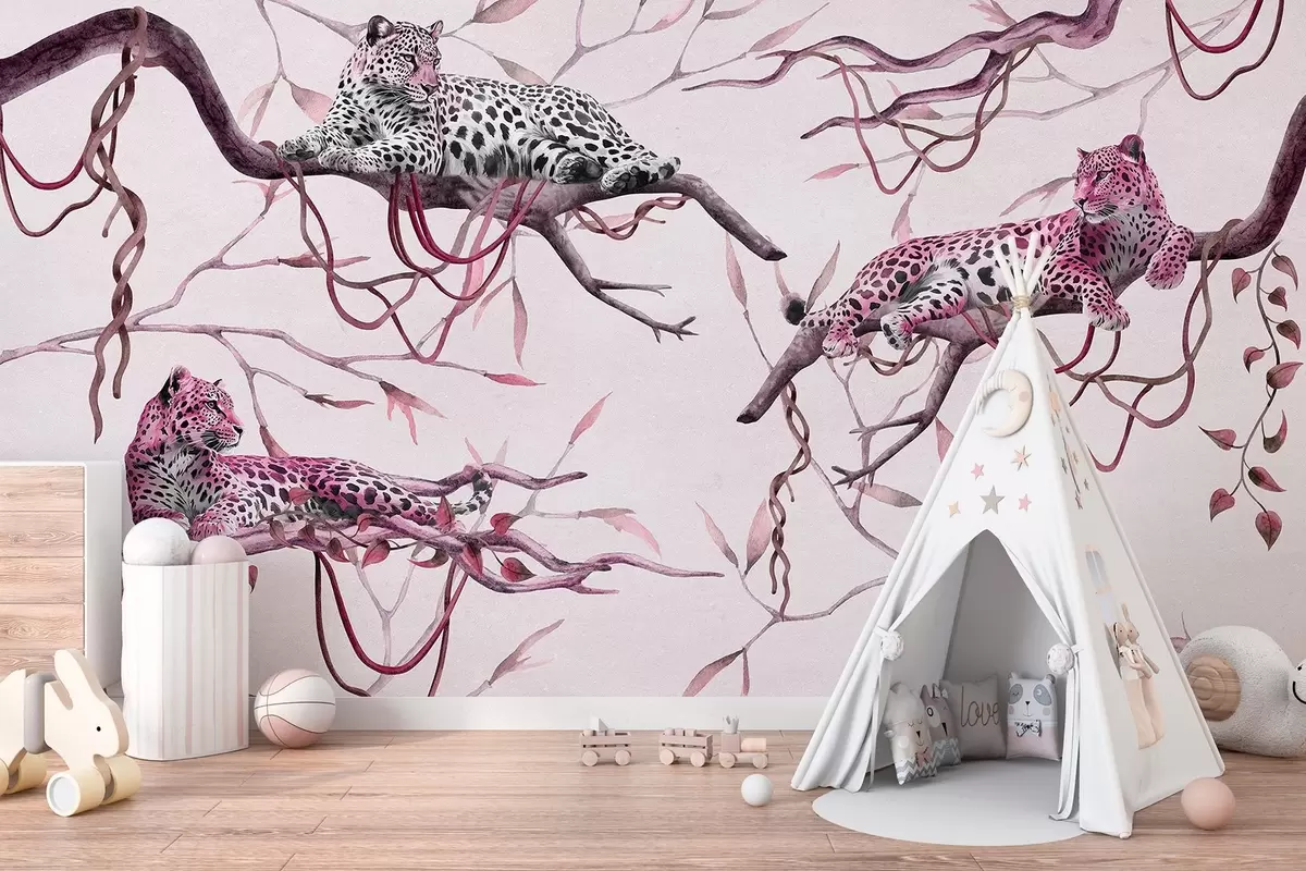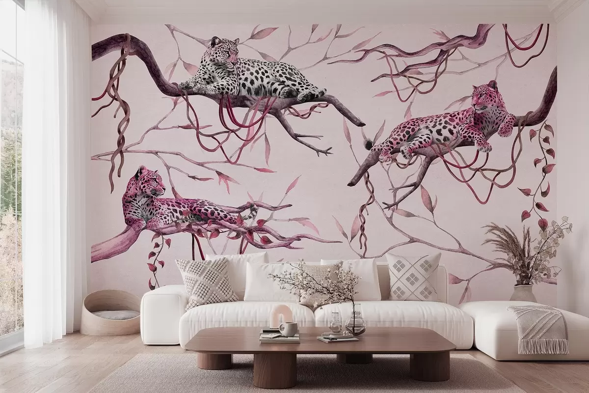 Zidne murale Leopardi na drveću džungle, lijane, tropske, divlje životinje, paleta ružičastih boja br. w03146v2