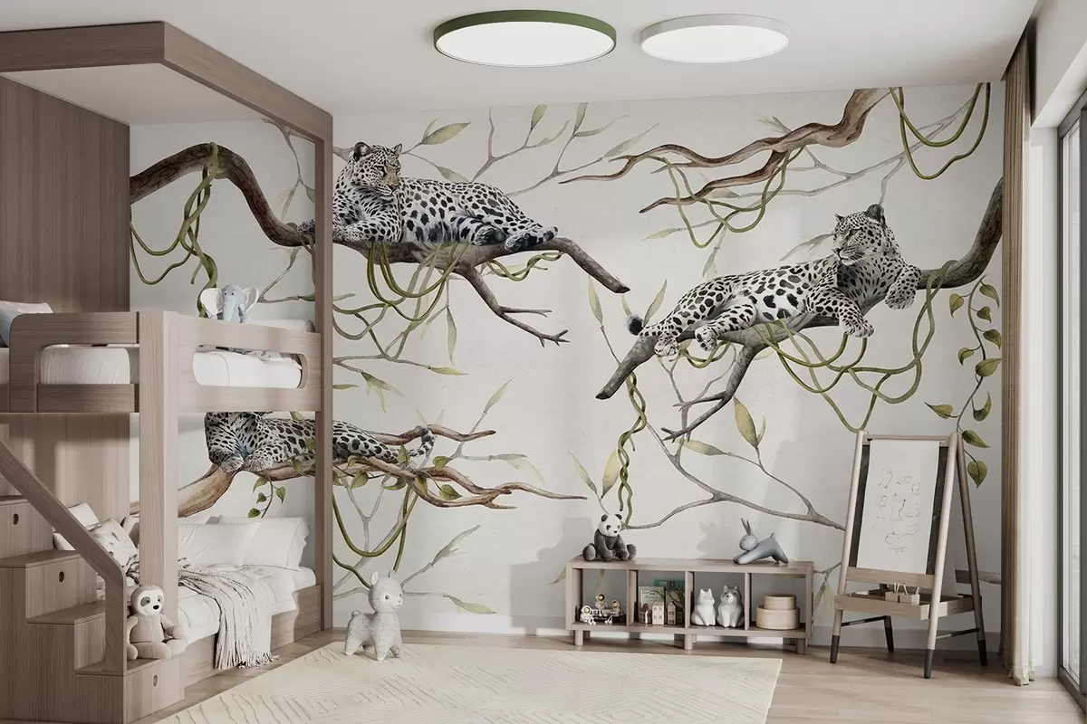Zidne murale Leopardi na drveću džungle, lijane, tropske, divlje životinje, paleta pastelnih boja br. w03146v4