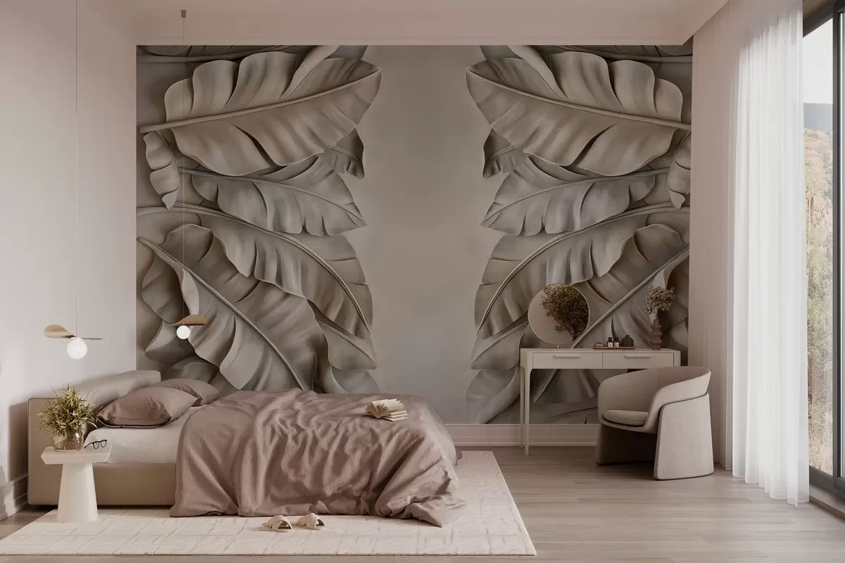 Zidne murale imitacija bas-reljefa s tropskim lišćem u bež tonovima br. w03285