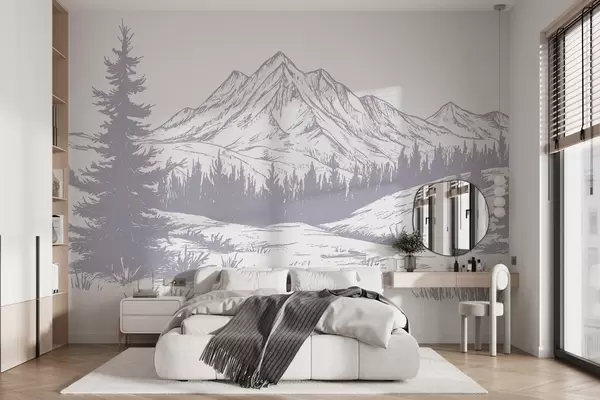Zidne murale Planinski krajolik s borovima, šuma, priroda, nježno ljubičasta boja br. w03344v2