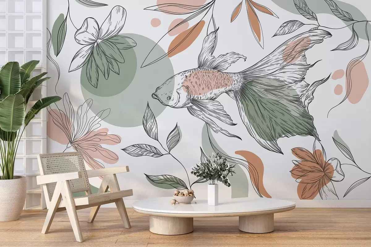 Zidne murale Crtanje ribe s cvijećem, minimalizam, morske, cvjetne, prirodne boje br. w03448
