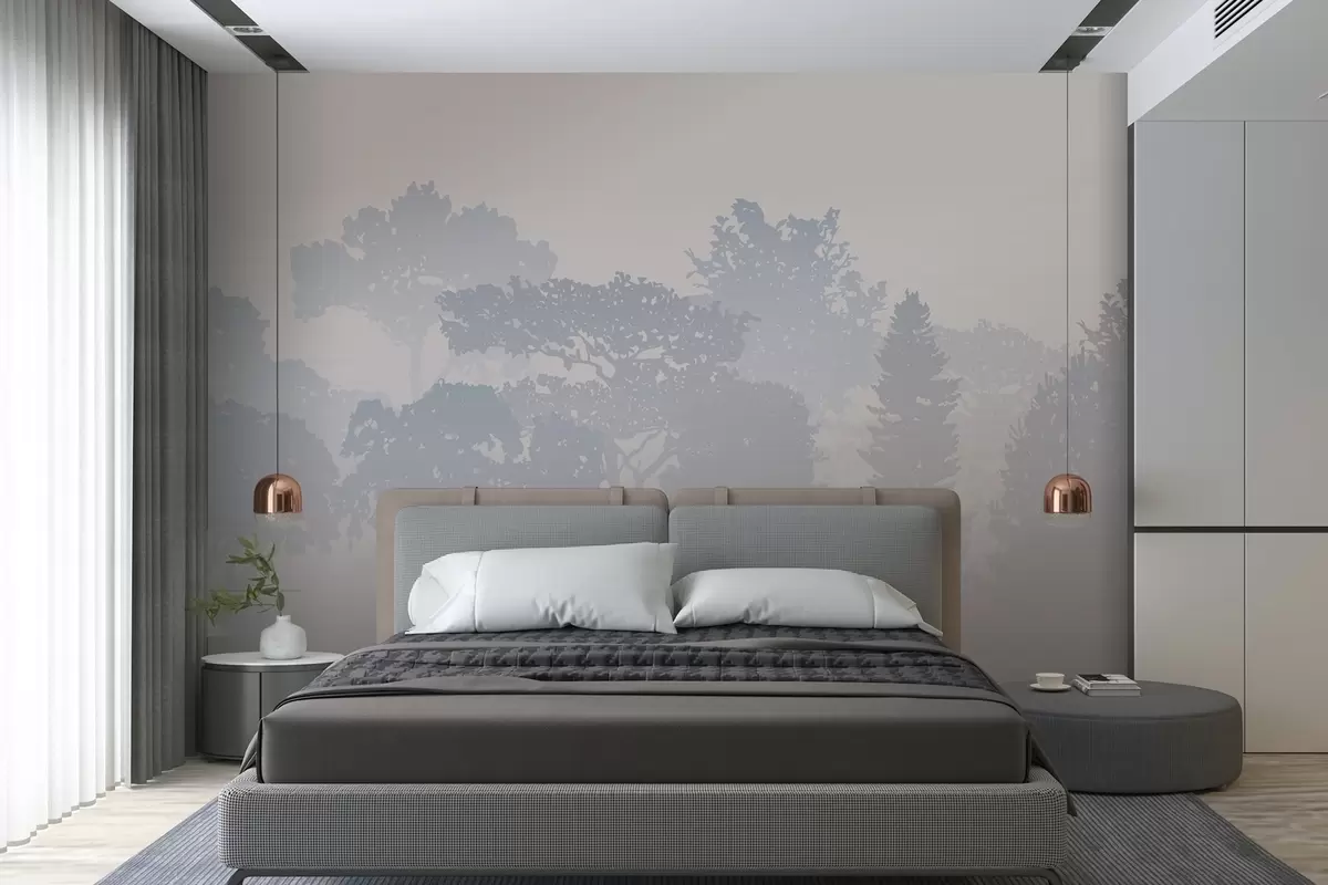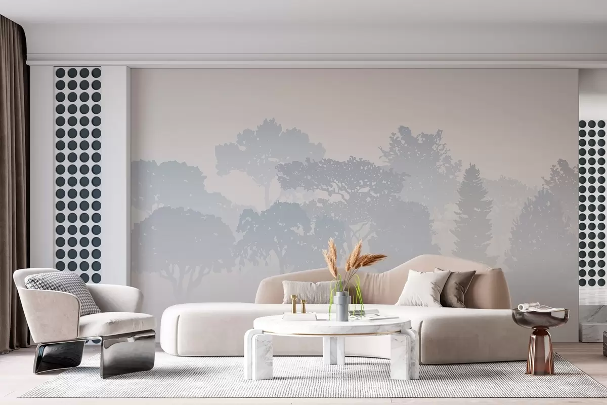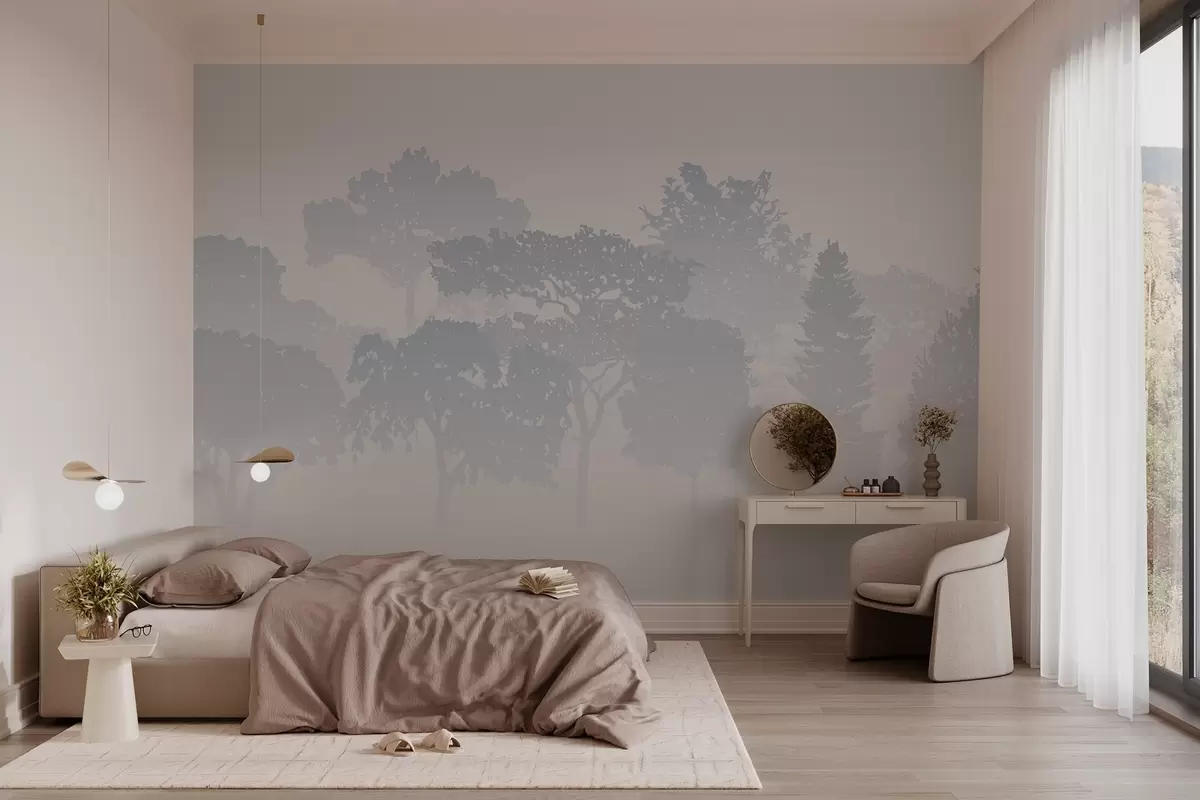 Zidne murale siluete drveća u izmaglici magle br. w03451