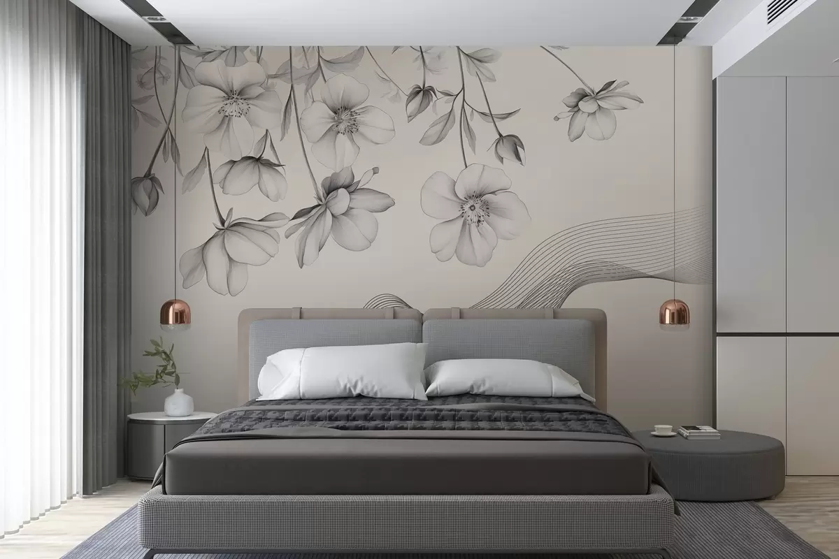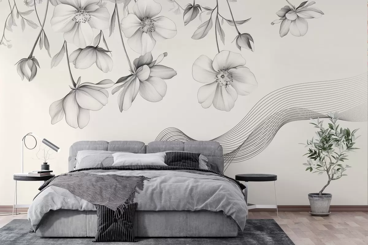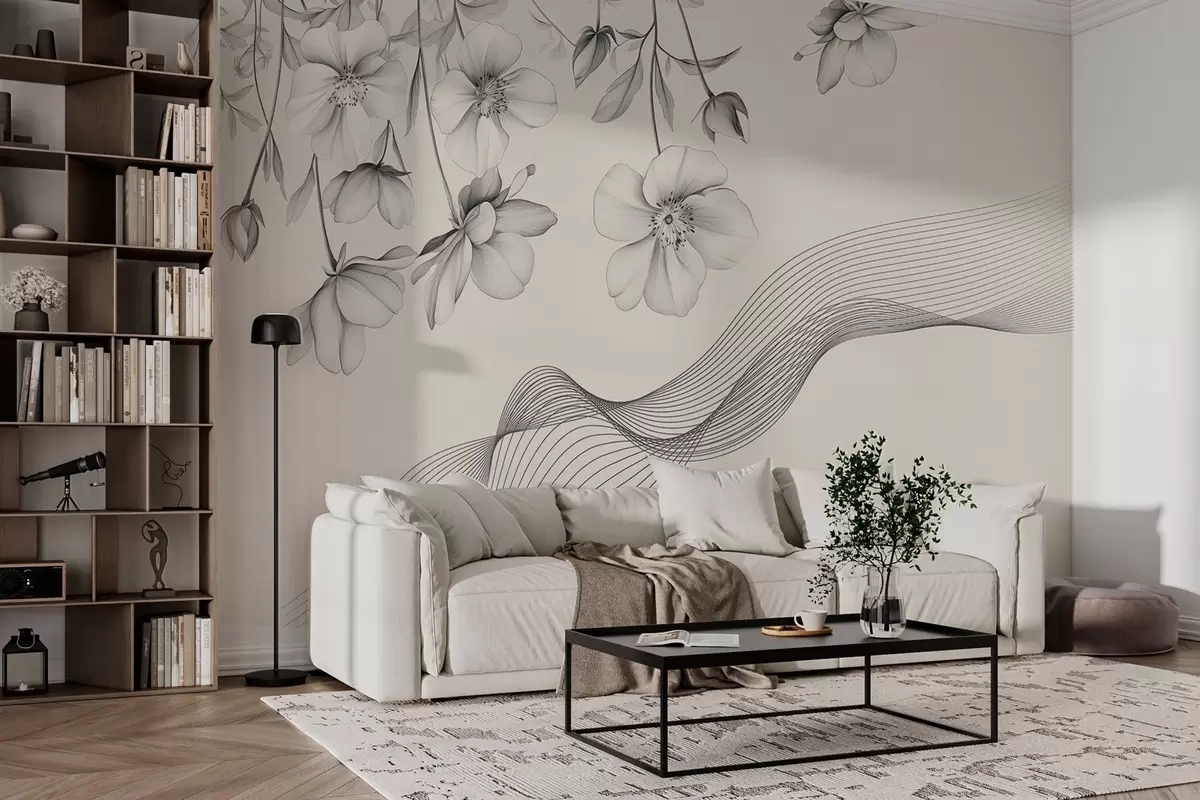 Zidne murale grafički cvjetovi i linije na svijetloj pozadini br. w03454
