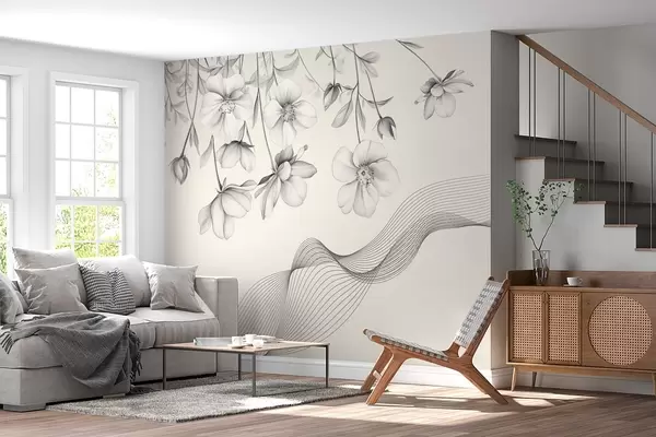 Zidne murale grafički cvjetovi i linije na svijetloj pozadini br. w03454