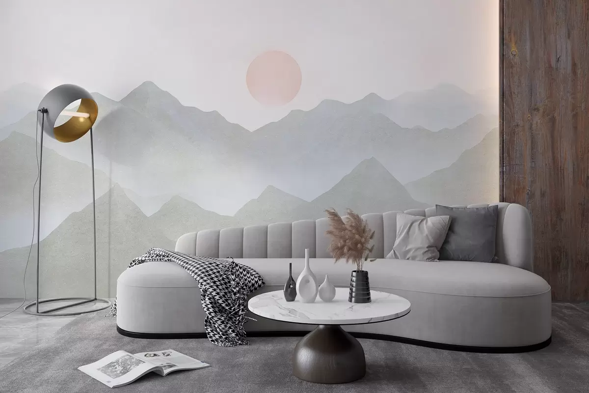 Zidne murale Planinski krajolik u boho stilu, zalazak sunca, nježno pastelno, sivo br. w03547v1