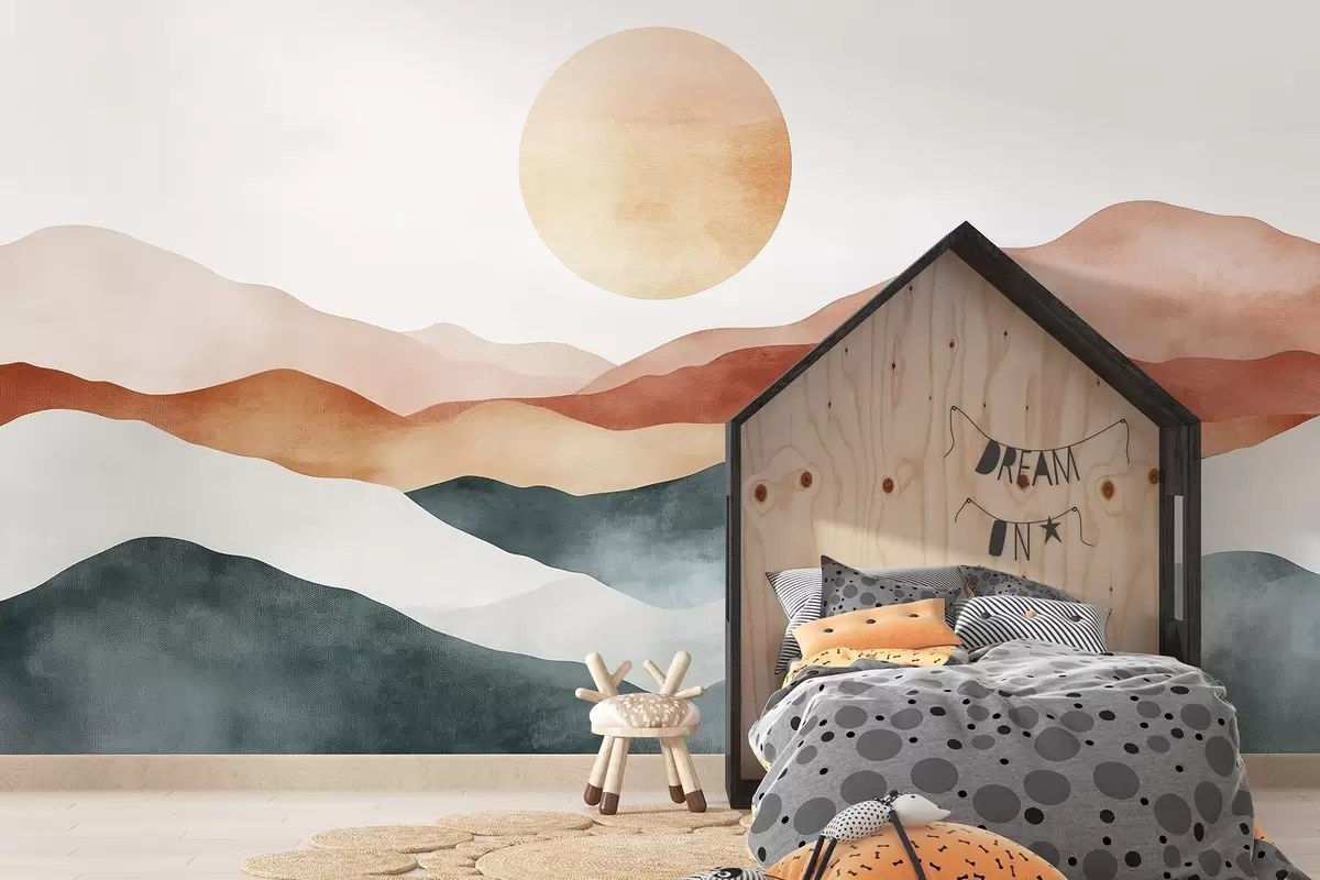 Zidne murale Akvarelne planine sa suncem, boho stil, crvena, narančasta, siva br. w03551