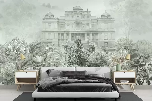 zidne murale Kraljevska palača s vrtom božura, stil akvarela, priroda, zelene boje, boho w03552v2