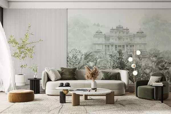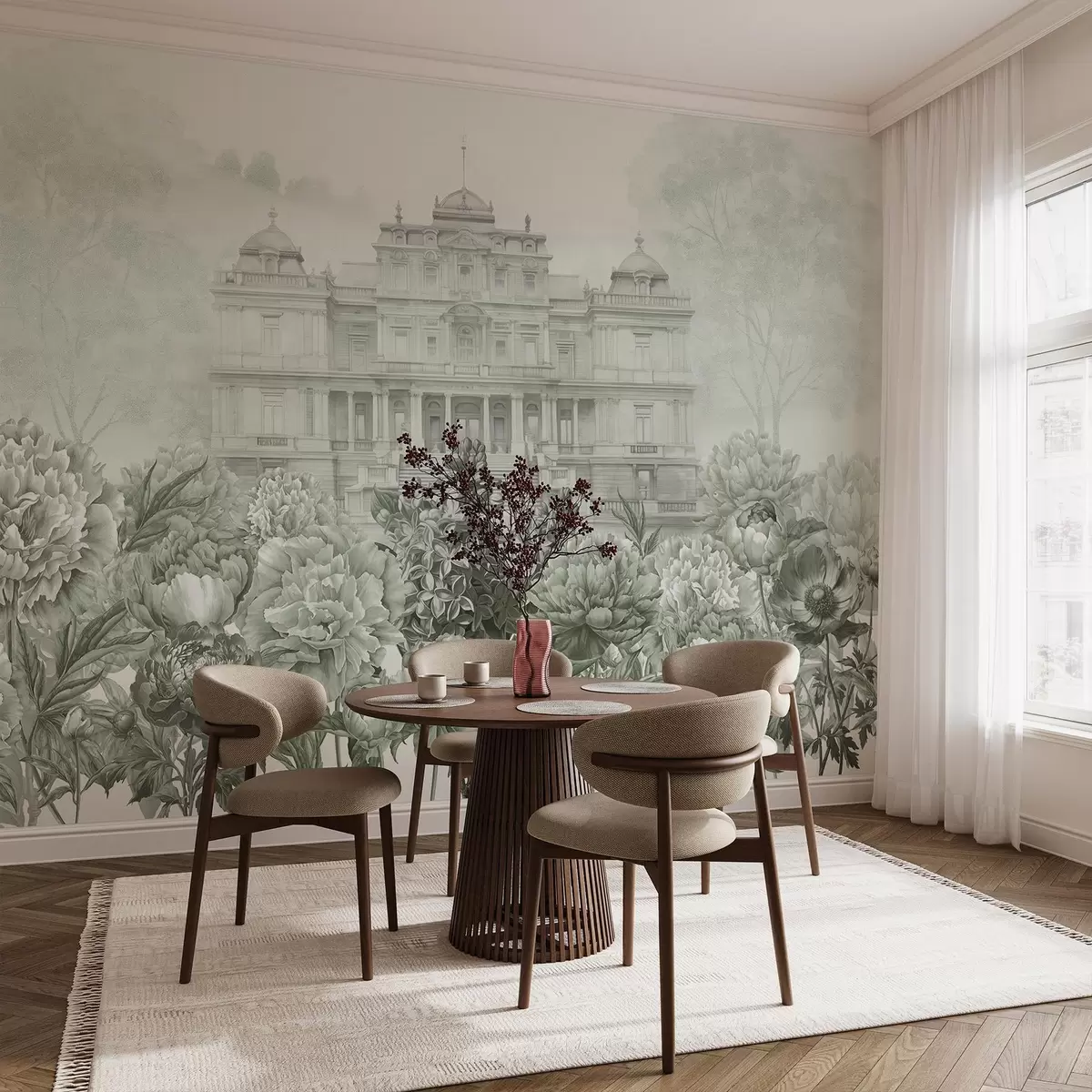 zidne murale Kraljevska palača s vrtom božura, stil akvarela, priroda, zelene boje, boho w03552v2