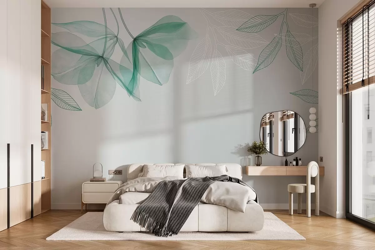 Zidne murale nježno prozirno cvijeće i lišće u zelenim tonovima br. w03616v1