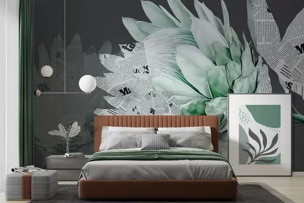 Zidne murale Protea cvijeće, novinska umjetnost, cvjetni, tropski, tamna pozadina, zelene boje br. w03667v3