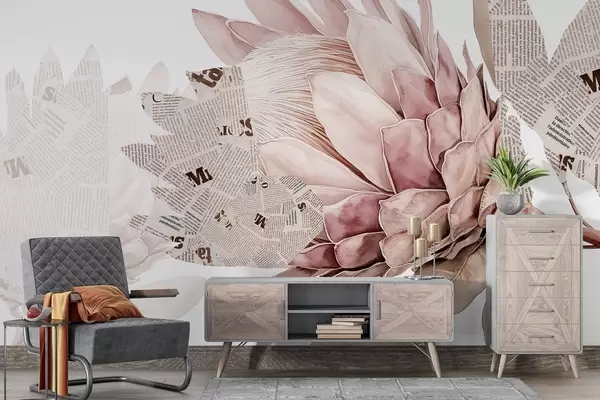Zidne murale Protea cvijeće, novinska umjetnost, cvjetne, tropske, pastelne bež boje br. w03667v4
