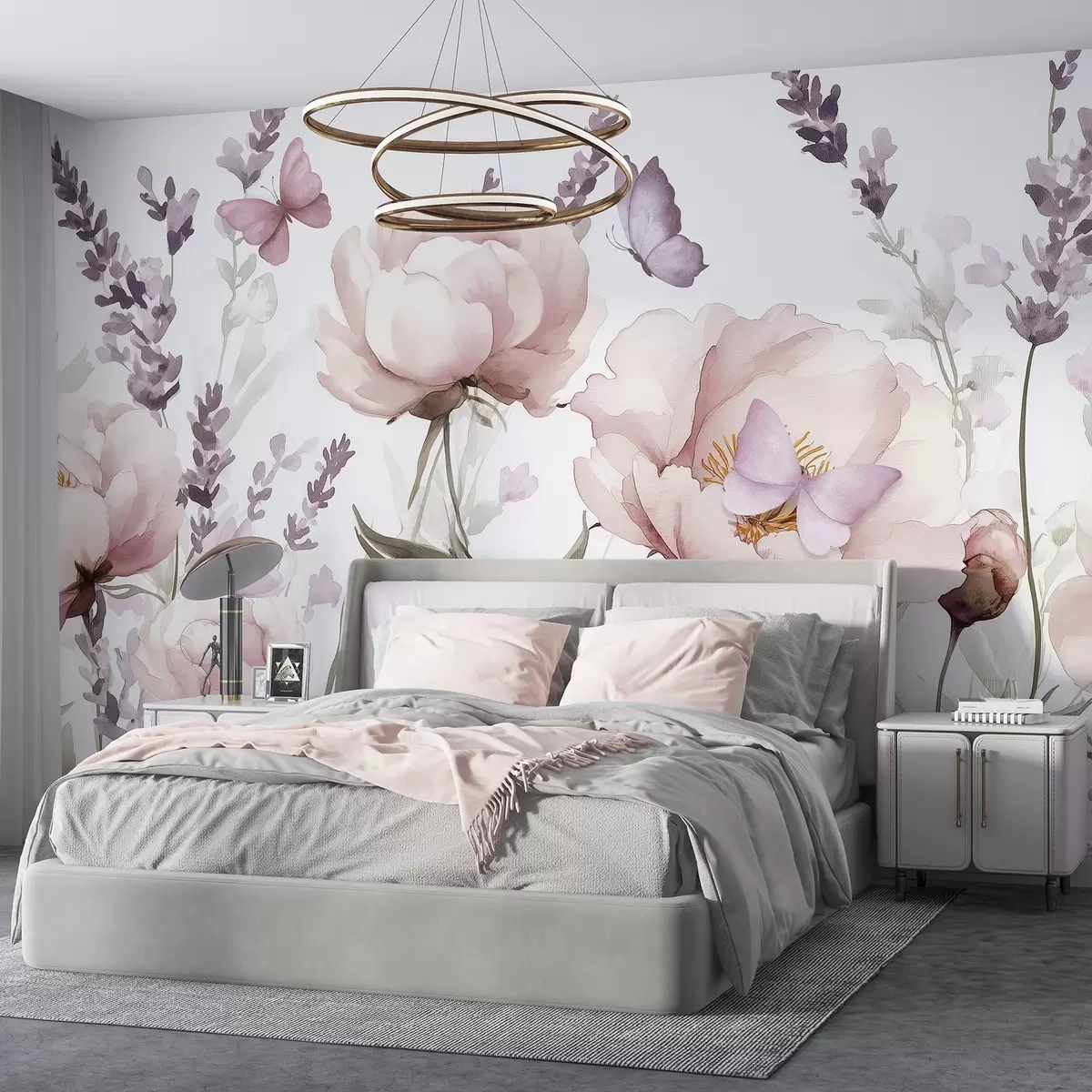 zidne murale Cvjetna livada, božuri, lavanda, leptiri, stil akvarela, ružičaste boje w03668