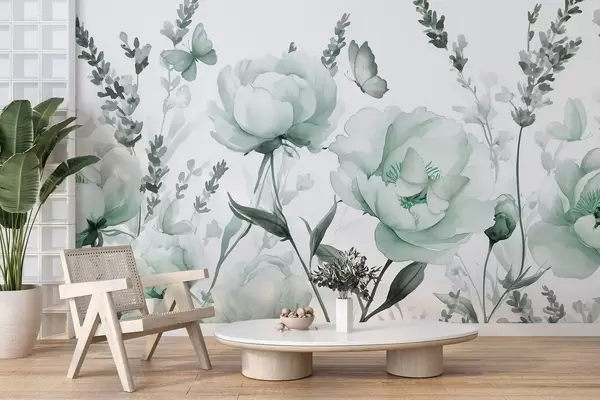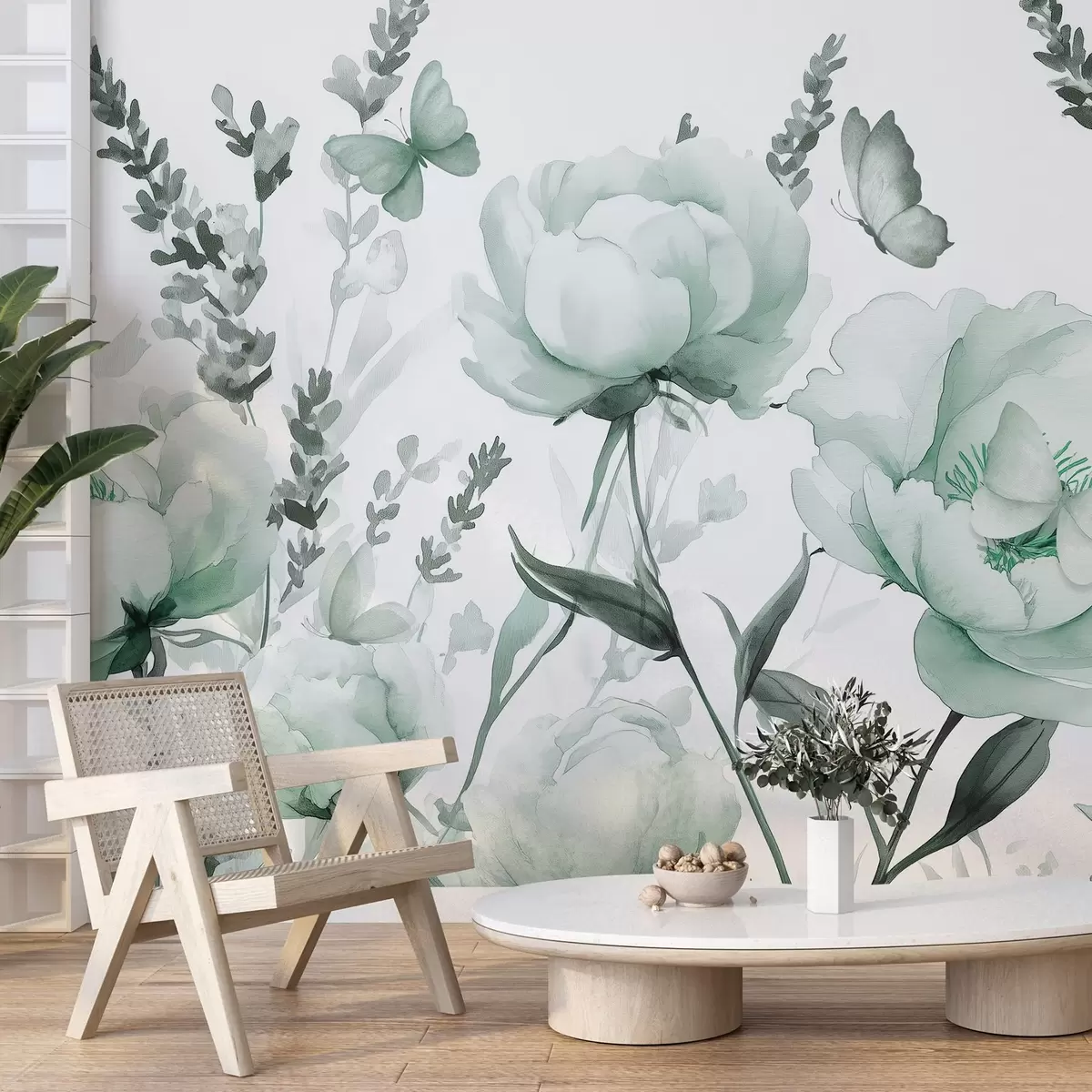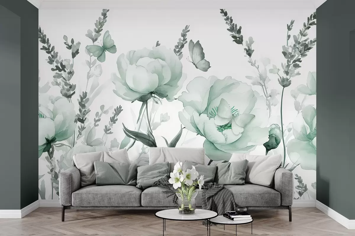 Zidne murale Cvjetna livada, božuri, lavanda, leptiri, stil akvarela, zelene boje br. w03668v1