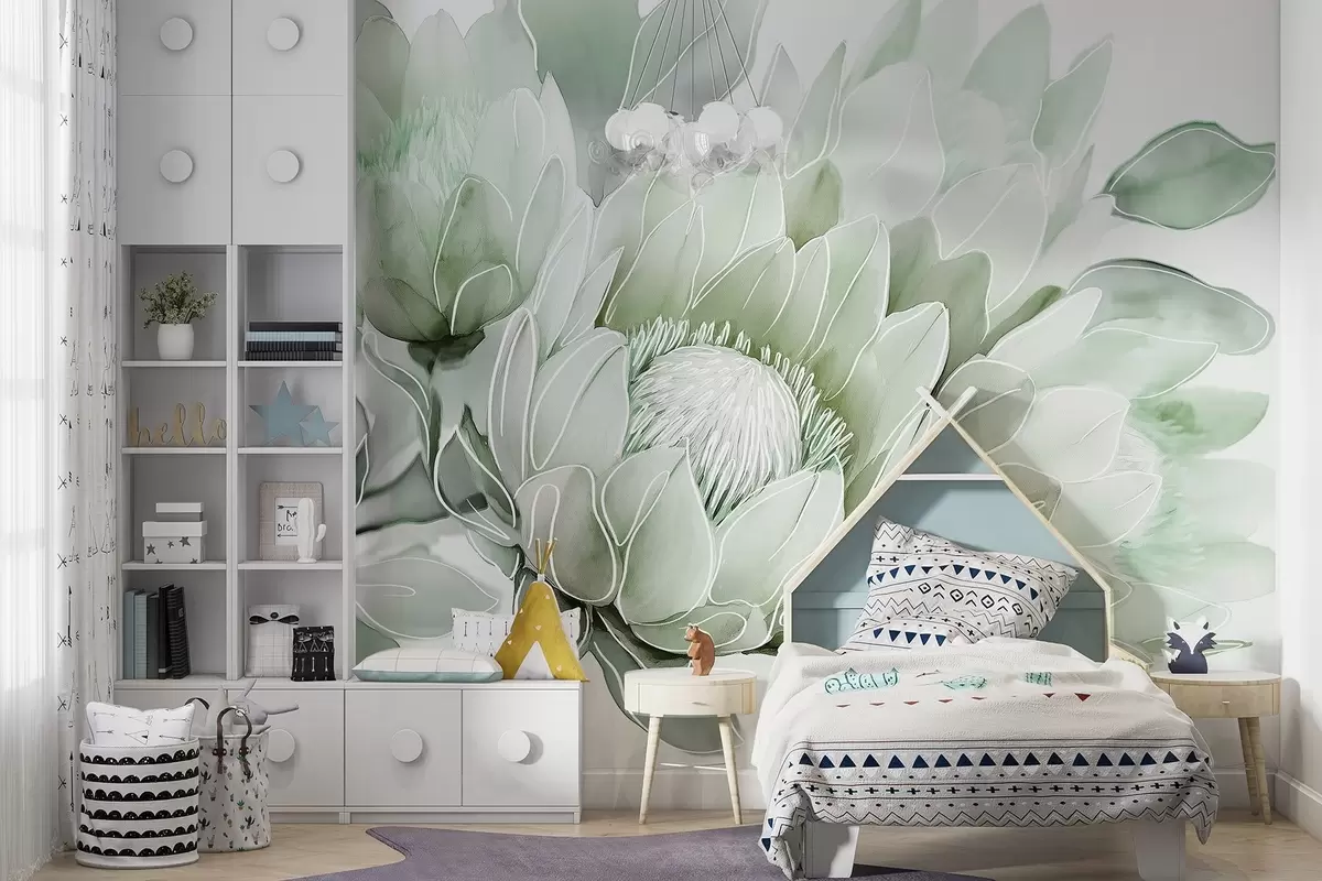 Zidne murale Prekrasno cvijeće protee, linijski crtež, tropske, zelene boje br. w03669v2