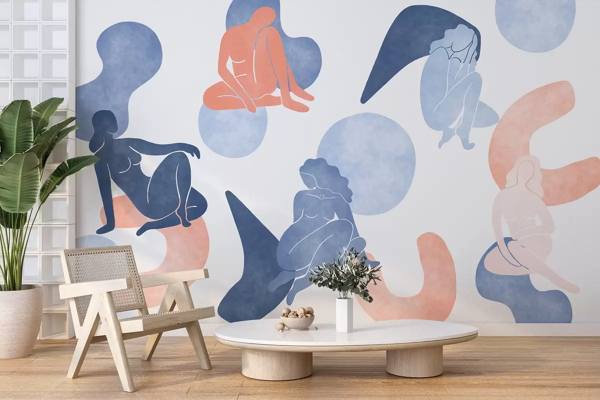 Zidne murale Geometrijske apstrakcije sa ženskim siluetama, boho stil, plava, bež, ružičasta br. w03753v1