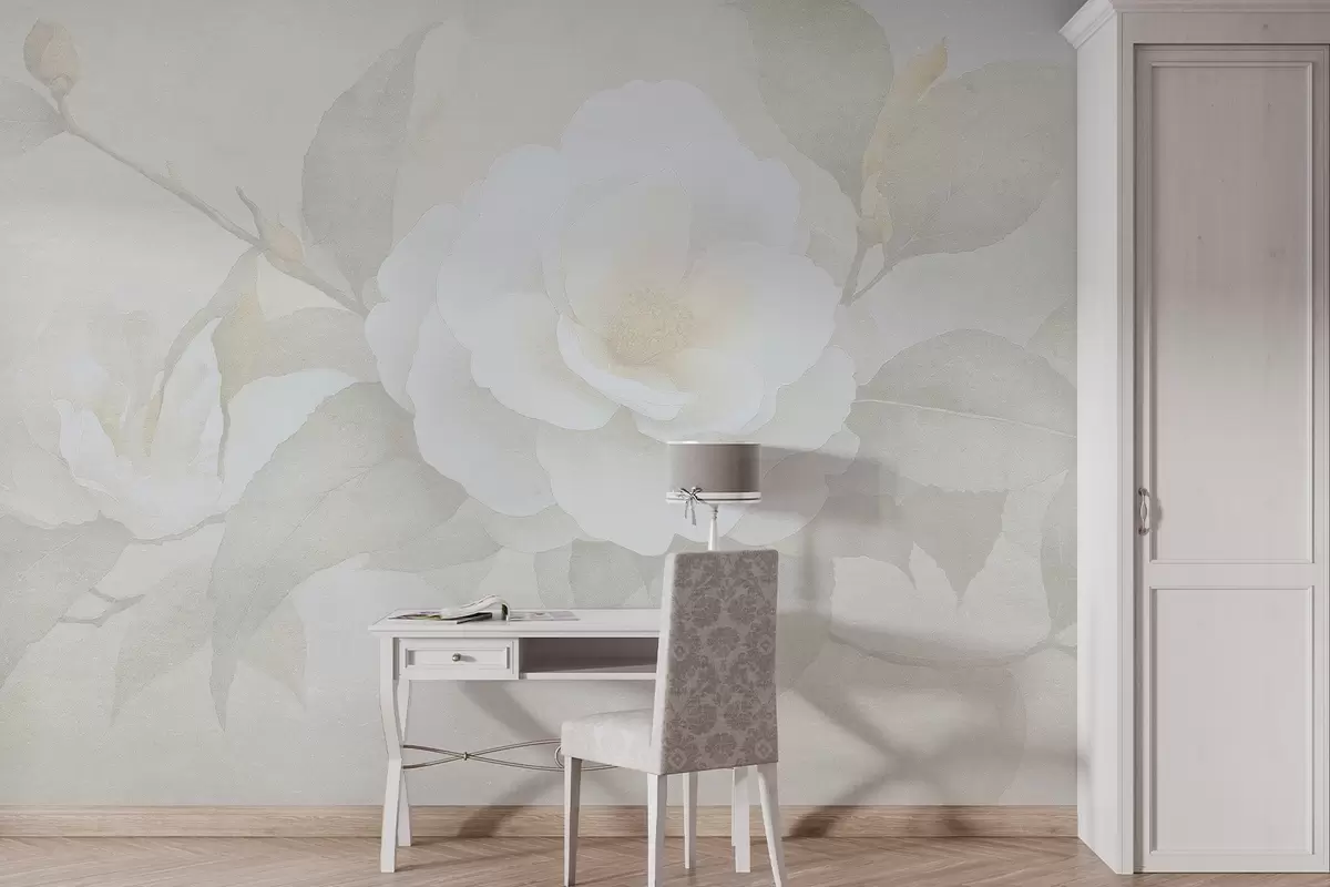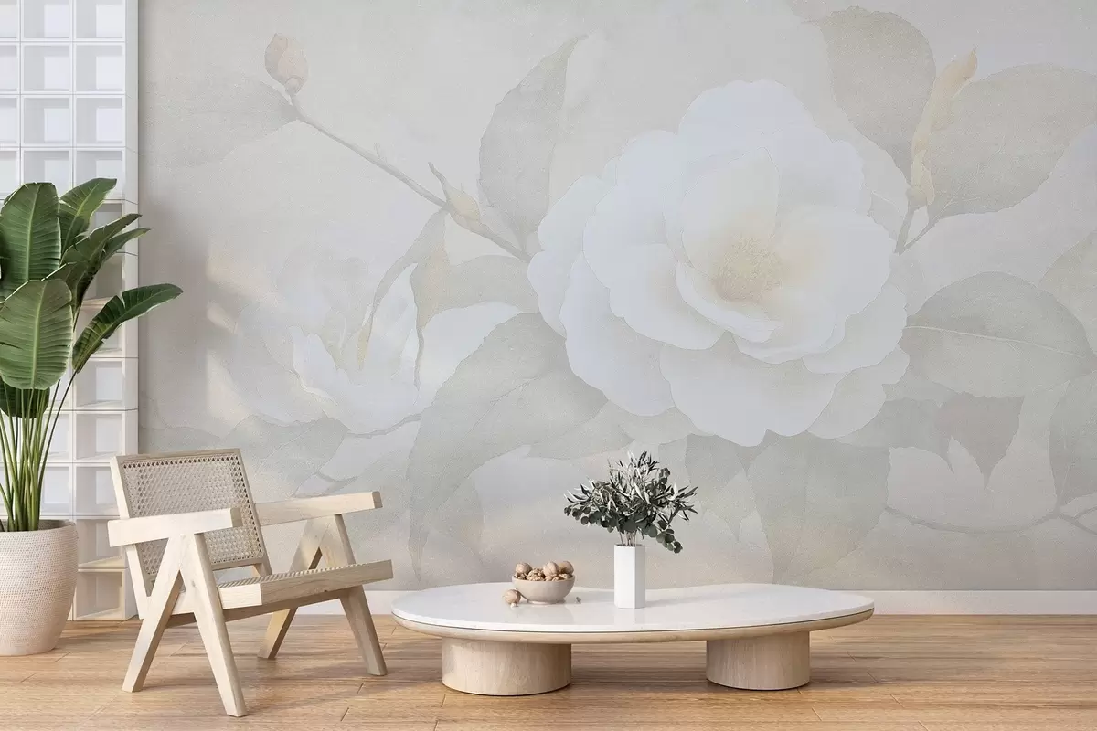 Zidne murale Nježni pastel sa cvjetovima kamelije na grani, bež boje br. w03760