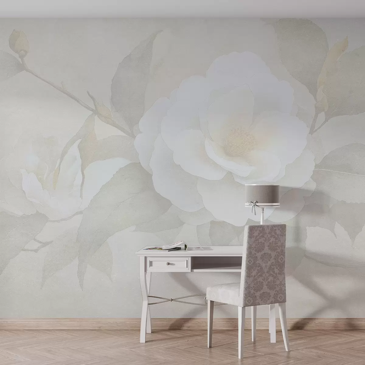 Zidne murale Nježni pastel sa cvjetovima kamelije na grani, bež boje br. w03760