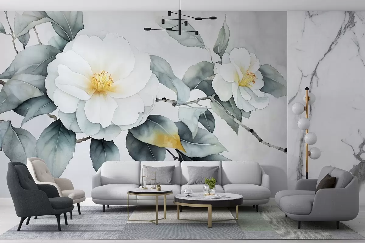 Zidne murale Cvjetovi kamelije na grani u stilu akvarela, prirodne boje br. w03761