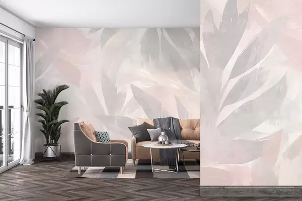 zidne murale Tropsko lišće, cvijeće, palme, pastelni stil, ružičaste i bež boje w03881