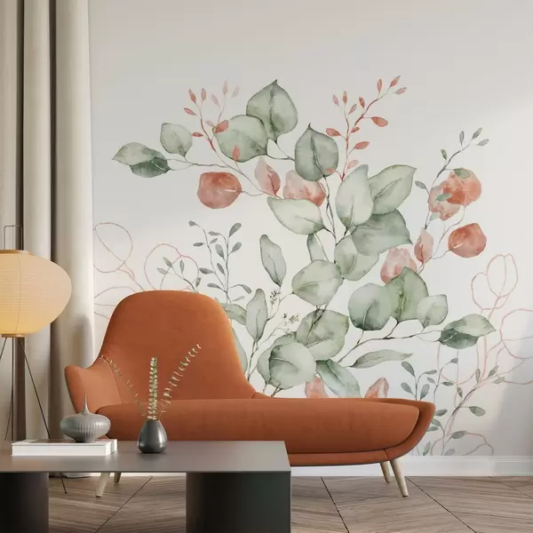 zidne murale Imitacija vegetacije i grana teksturiranim akvarelom, nijanse zelene i crvene w03927v1