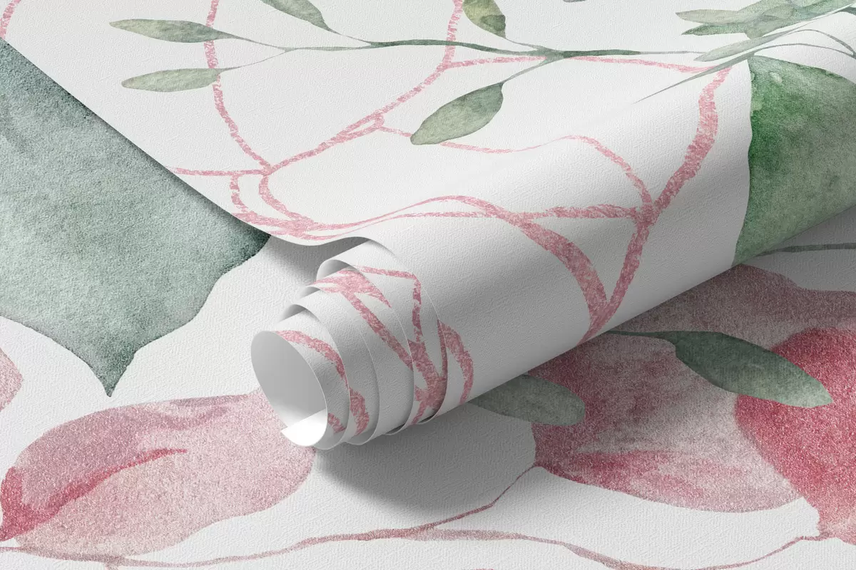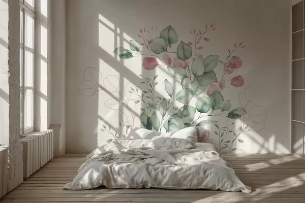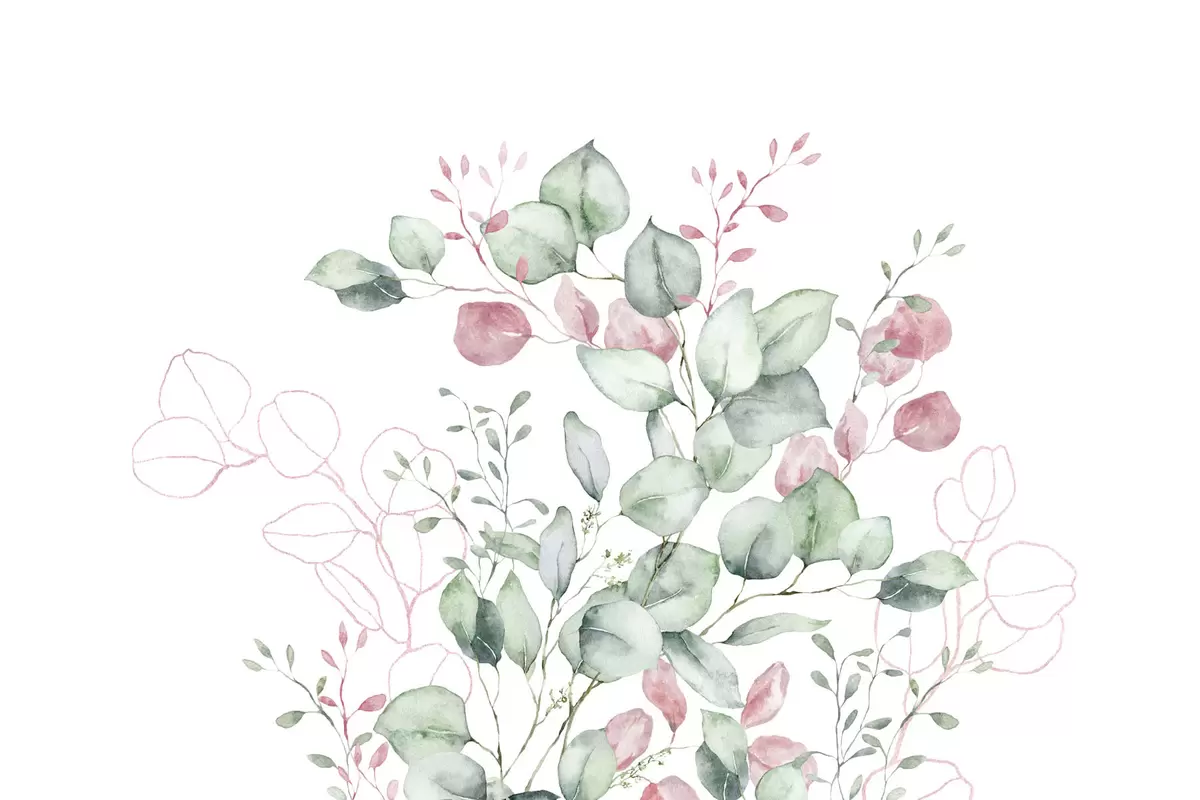 Zidne murale Imitacija vegetacije i grana teksturiranim akvarelom, nijanse zelene i ružičaste br. w03927v2