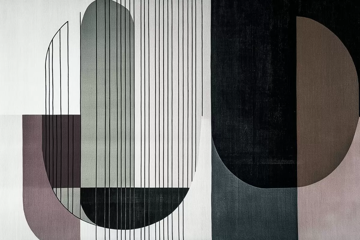 Zidne murale Moderna apstraktna geometrijska kompozicija s preklapajućim oblicima i uzorcima okomitih linija, tanke linije koje ispunjavaju trapezoide i ovale, mekani sloj tekstilne teksture, topli prigušeni tonovi poput maslinasto zelene, taupe, bež i ugljeno zelene, suptilni efekti prozirnosti između oblika br. w03937v1