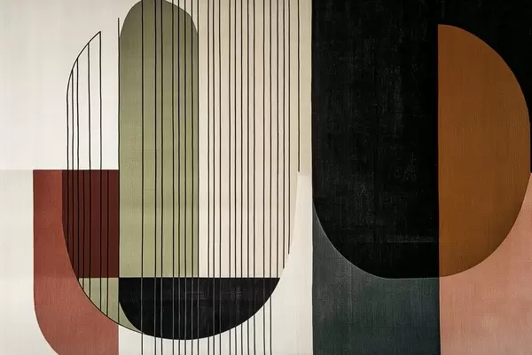Zidne murale Moderna apstraktna geometrijska kompozicija s preklapajućim oblicima i uzorcima okomitih linija, tanke linije koje ispunjavaju trapezoide i ovale, mekani sloj tekstilne teksture, topli prigušeni tonovi poput maslinasto zelene, taupe, bež i ugljeno zelene, suptilni efekti prozirnosti između oblika br. w03937v4