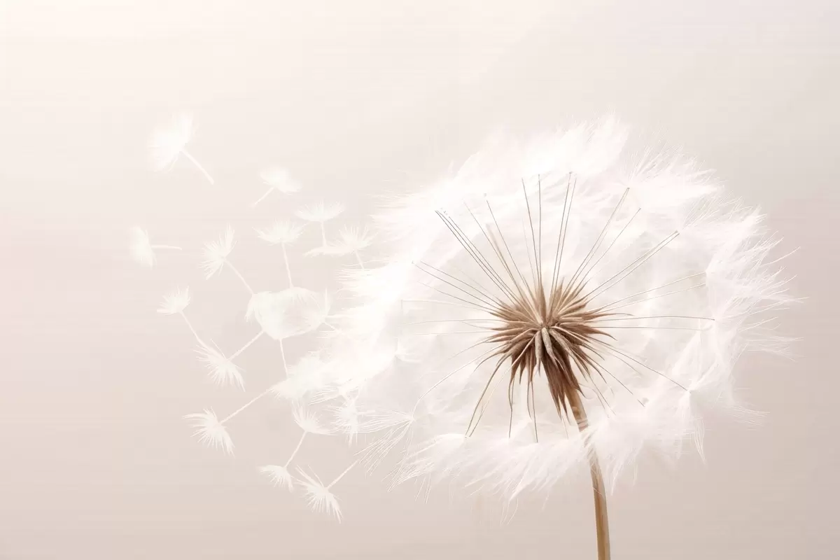 Zidne murale Moderna nježna cvjetna kompozicija s potpuno rascvjetalom glavicom maslačka i plutajućim sjemenkama, uz nježnu teksturu nalik tekstilu br. w03939