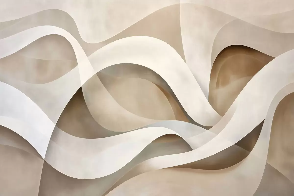 Zidne murale apstraktna minimalistička kompozicija slojevitih organskih oblika, svaki ocrtan mekim bijelim rubom, ispunjen gustim unutarnjim linearnim potezima, poput teksture tkanine ili papira, tekuće krivulje u neutralnim bež, pješčanim, kamenim i tonovima slonovače, reljefni izgled br. w03940