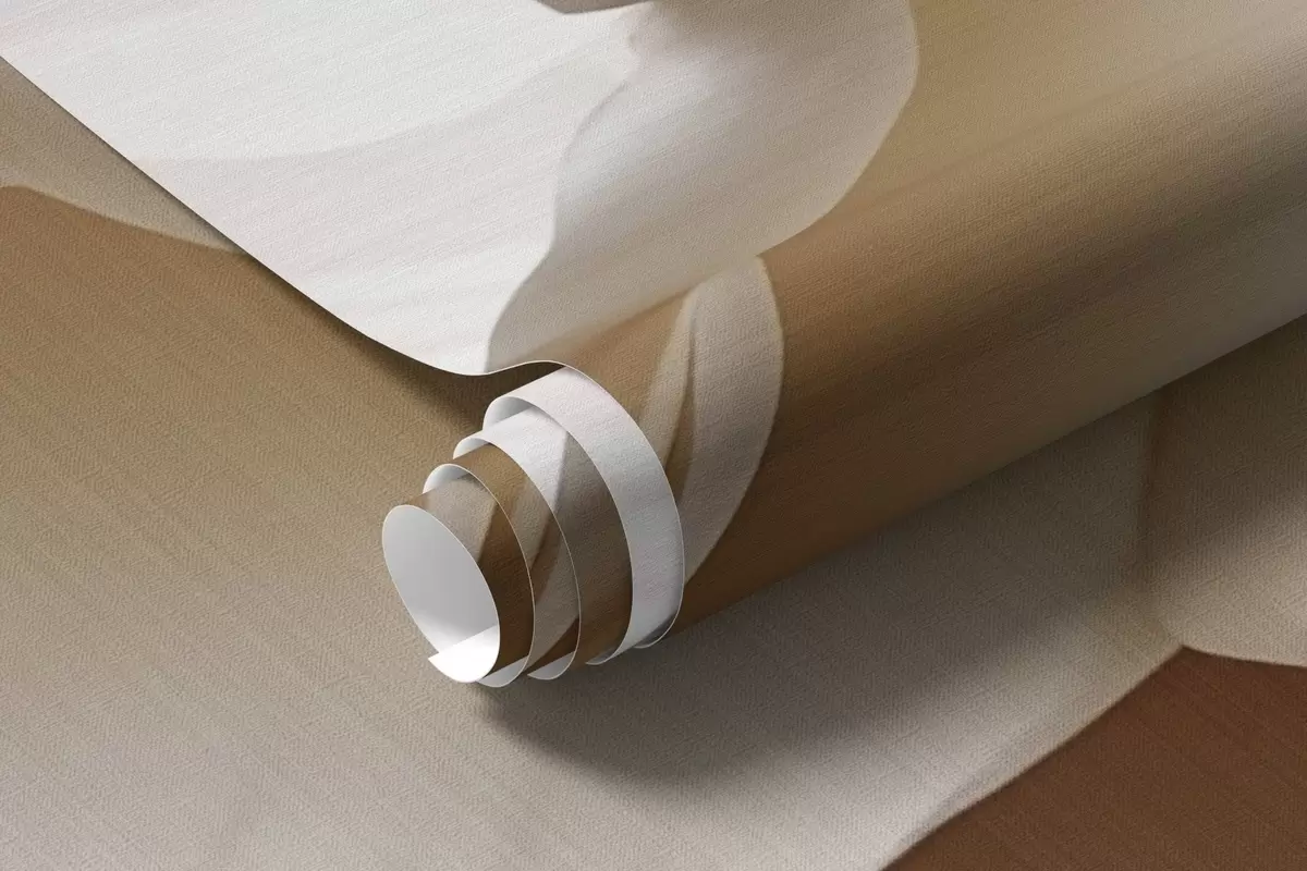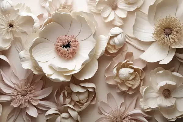 Zidne murale Volumetrijska cvjetna kompozicija s nježnim laticama inspiriranim papirom ili tekstilom u tonovima slonovače, vanilije i rumenila, postavljena na toplom bež platnu. br. w03945